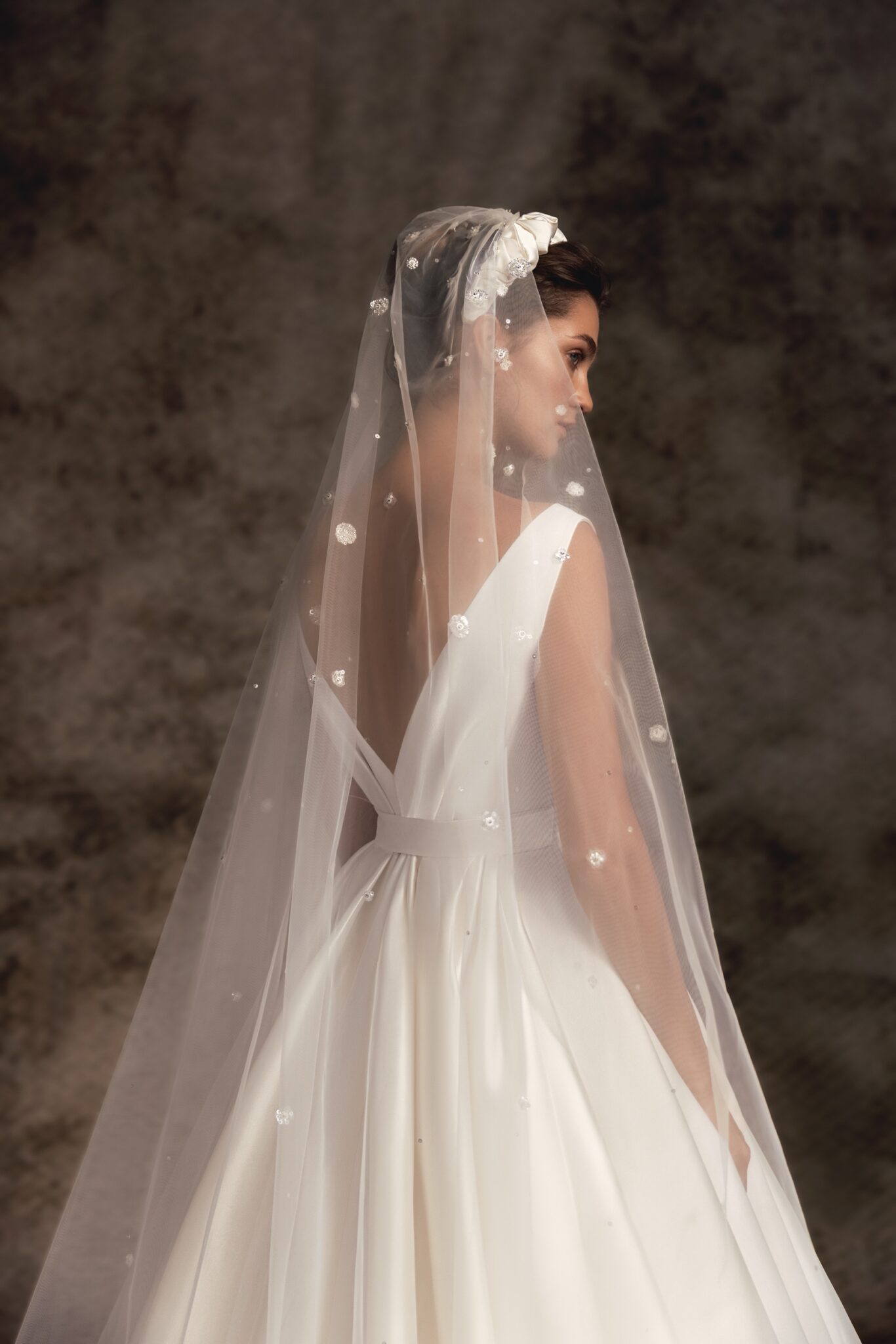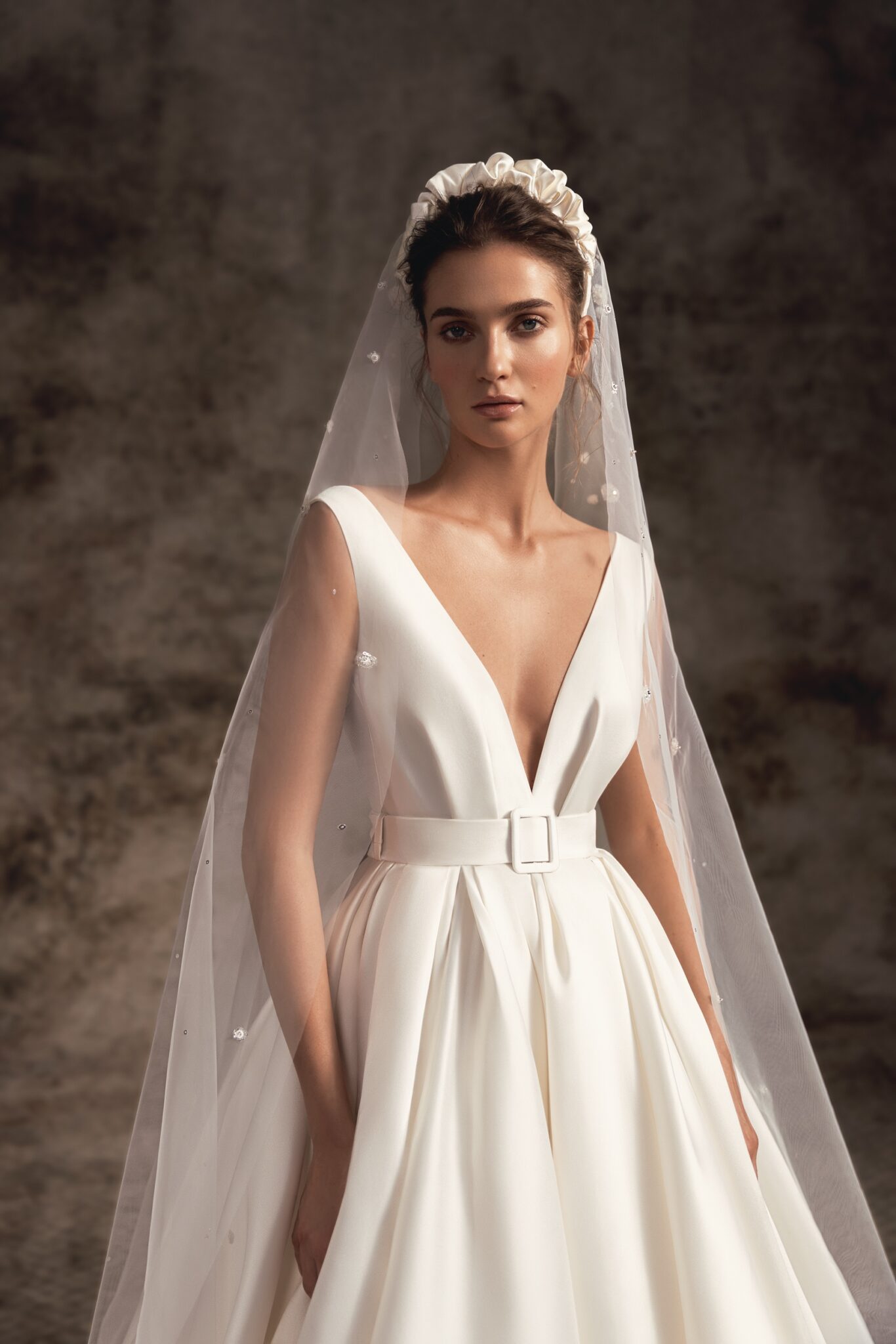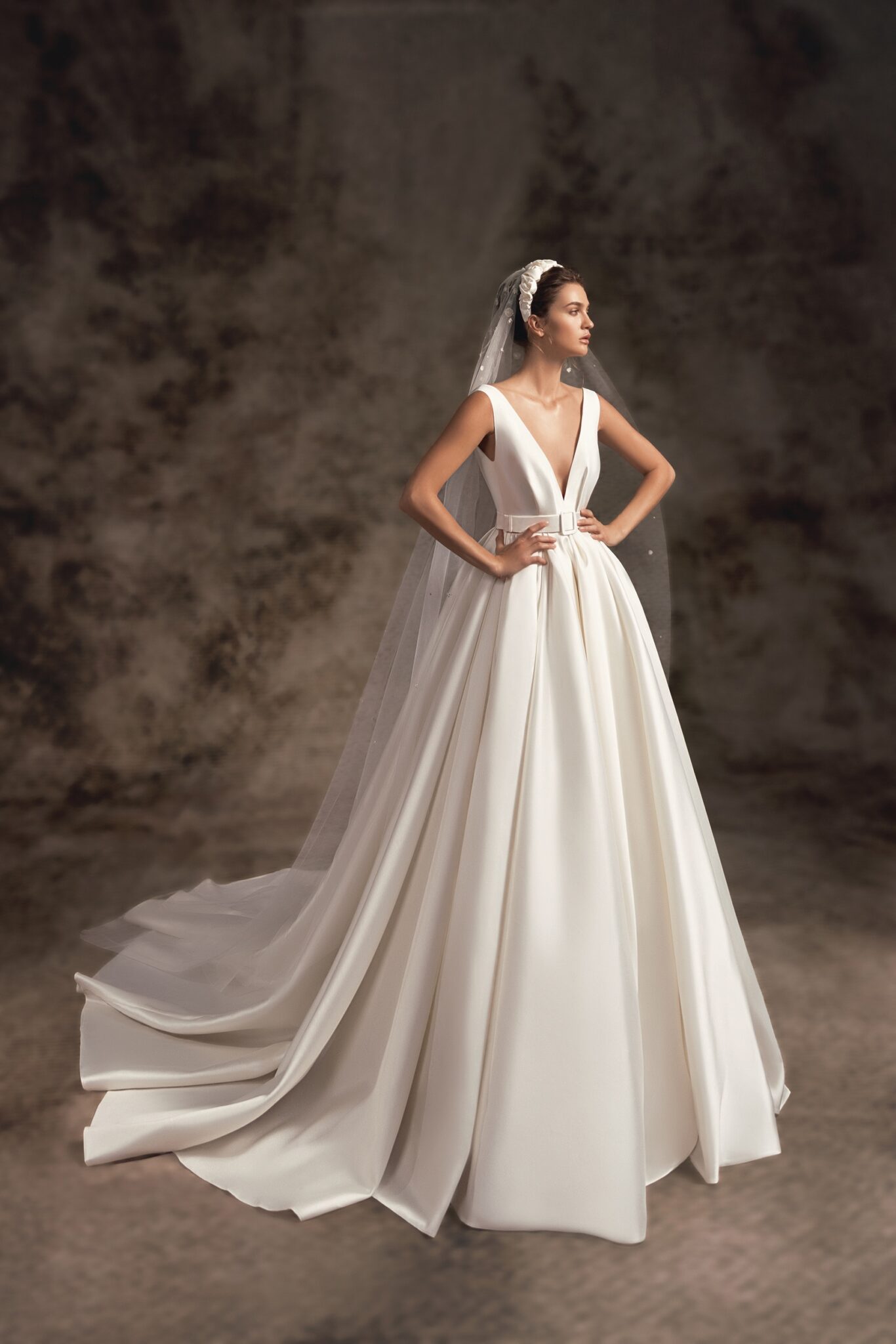 Notte d'OperaRosemary is an aluring and romantic statement satin ballgown with a deeply plunged V-neck corset with neat satin straps. The waistline is decorated with pleats and a belt with a buckle that accentuates the figure. A voluminous full satin skirt softly falls into a cathedral-length train.