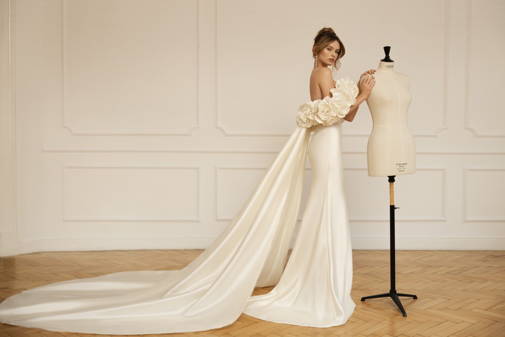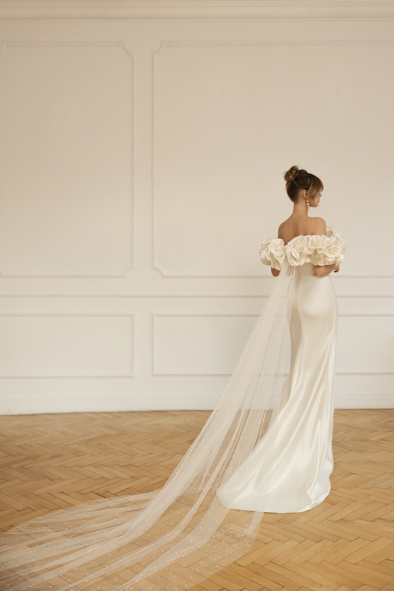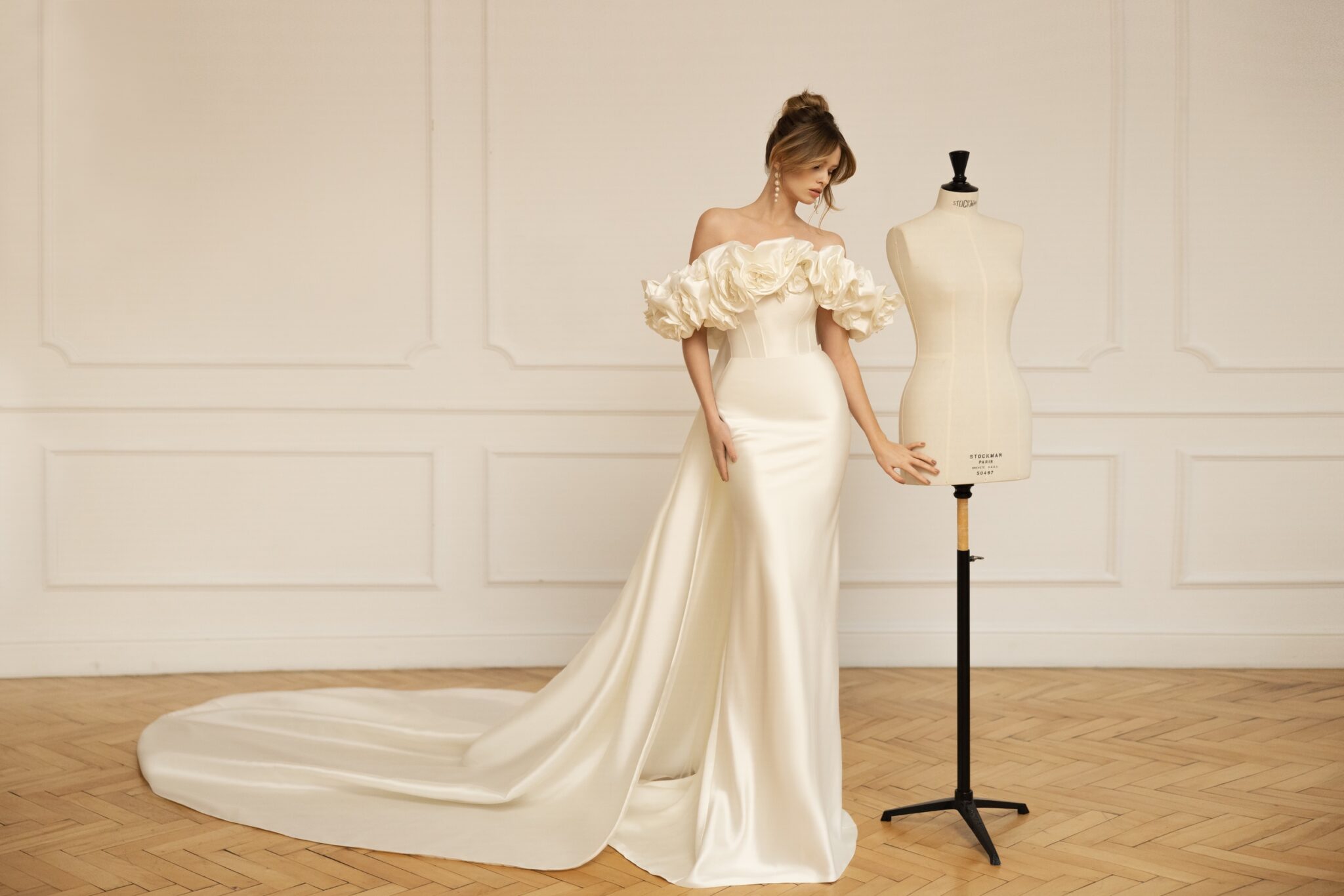 Less is more 2023, Plus Size, Sample SaleThis fit and flare luxurious mikado dress provides a classic look with a modern twist. The highlight of the dress is its removable off-the-shoulder cape made of numerous oversized roses that flatter from the front neckline to the back. Beautiful fitted bodice passes into a butter soft mikado skirt that embraces the bride’s figure. There are two options of a detachable train – a stylish Mikado silk one and a weightless Tulle decorated with artificial pearls – that is fastened on the back and visually elongates the silhouette