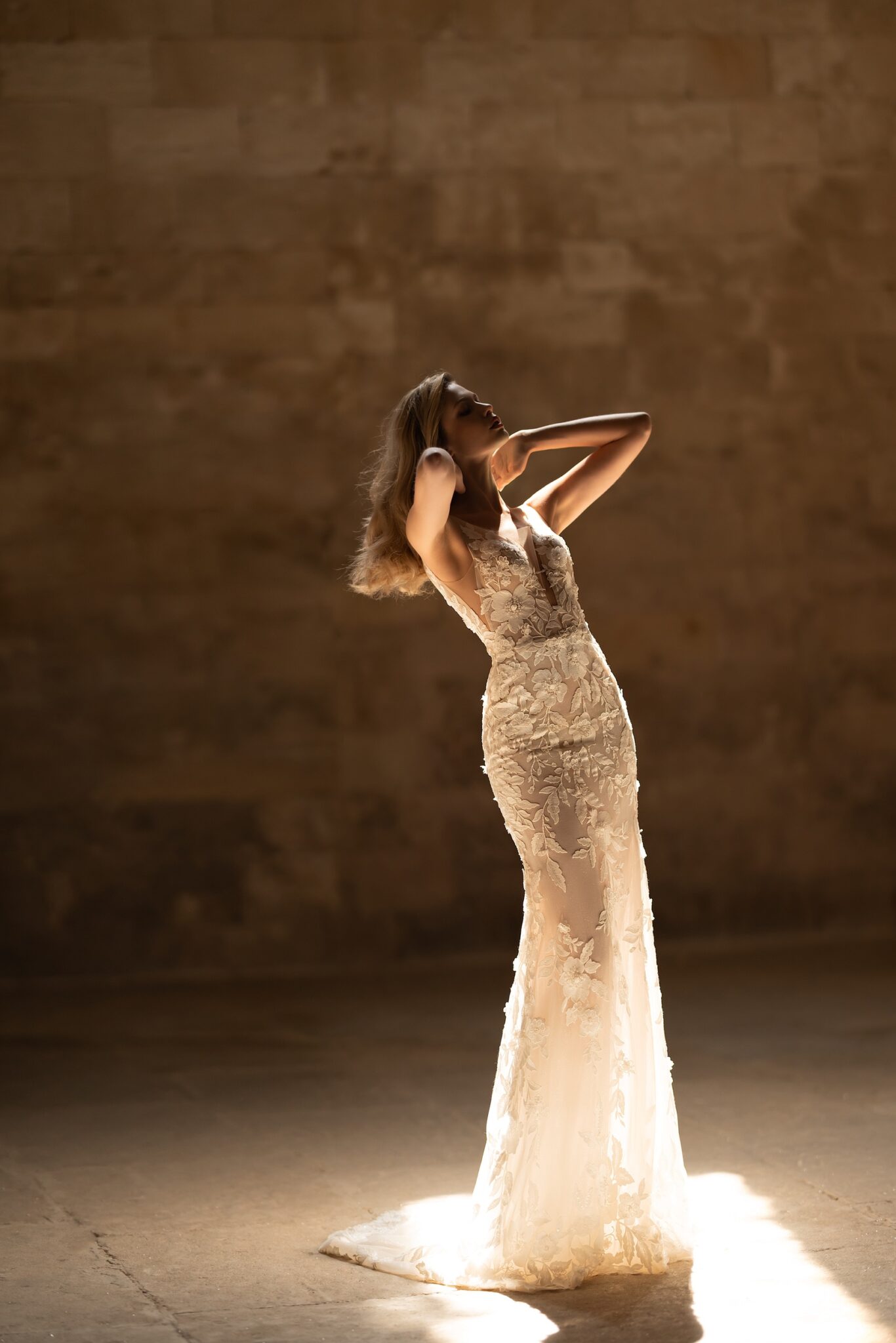 Love SpellPresenting our enchanting mermaid wedding dress, a masterpiece of romance and sophistication. Crafted from luxurious shimmer fabric, this dress exudes an ethereal glow that will illuminate your path down the aisle. Adorned with exquisite 3D floral appliques, each delicately handcrafted and adorned with glistening beads, this dress is a true work of art. The deep V-neckline adds a hint of allure, accentuating your natural beauty and enhancing your feminine grace. And for an added touch of elegance, we offer a detachable tulle cape, allowing you to transform your look effortlessly from ceremony to reception.