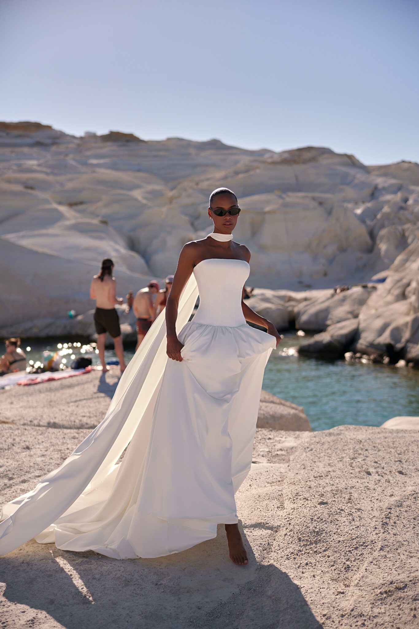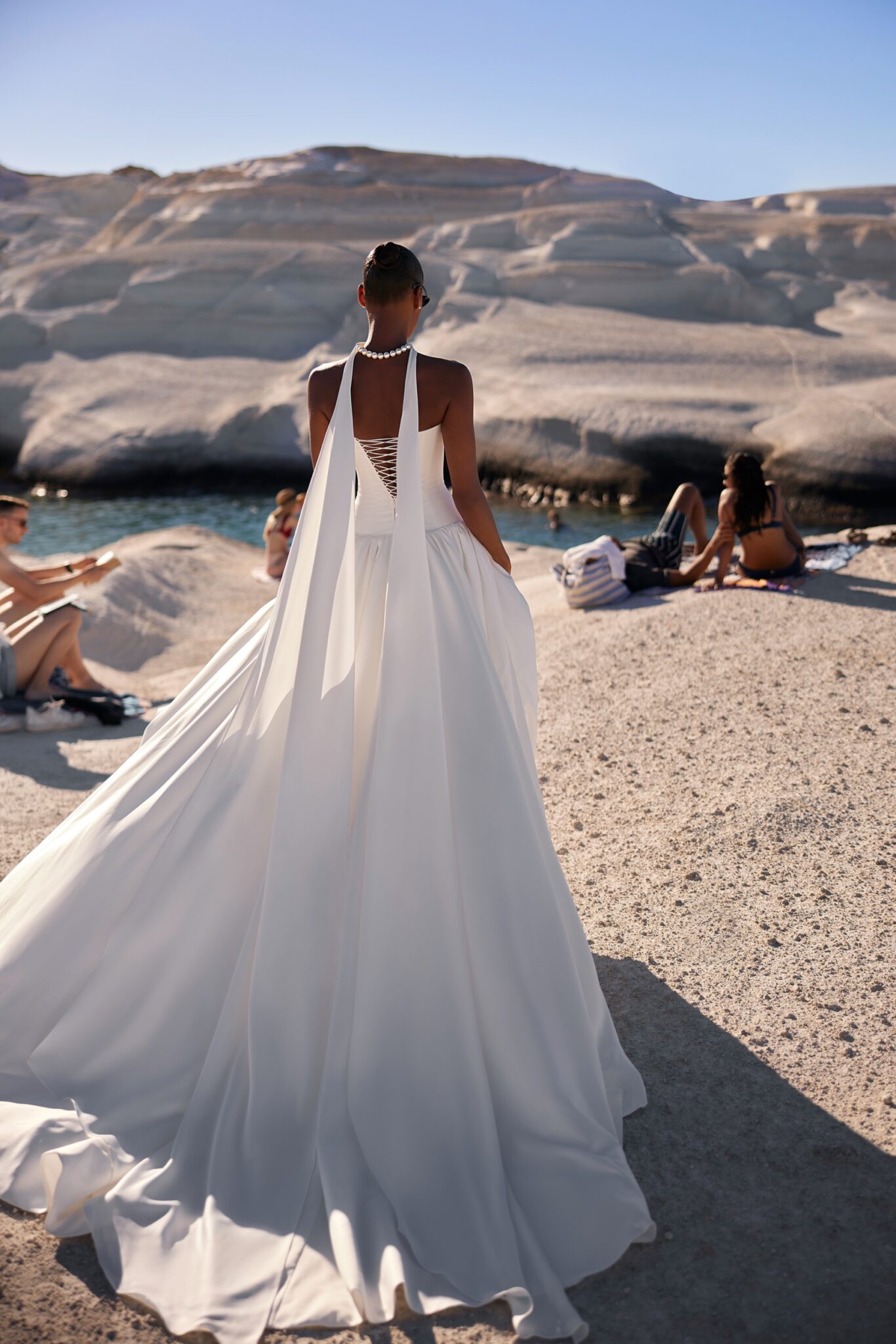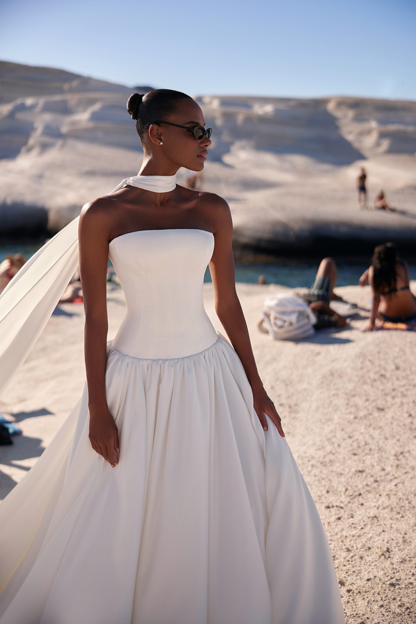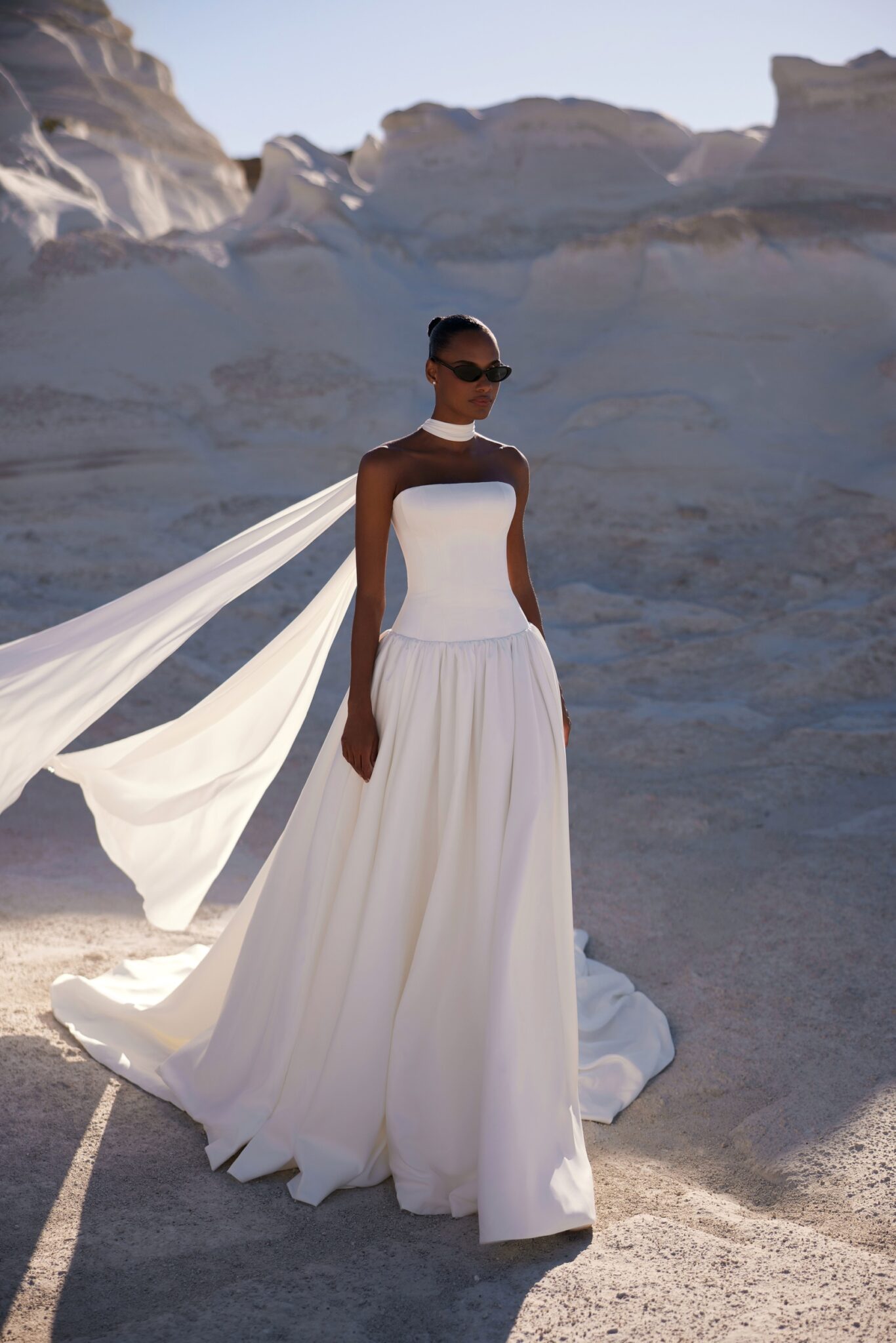 Venus, Plus SizeSleek design bridal gown with a simple minimalist corset featuring a cold-shoulders neckline and a dropped waistline, creating a more defined silhouette. The upper part of the skirt is slightly puffed, while the silky hem descends into a significant train. The striking detail is a choker made of the same fabric, falling freely on the back and complementing the train.