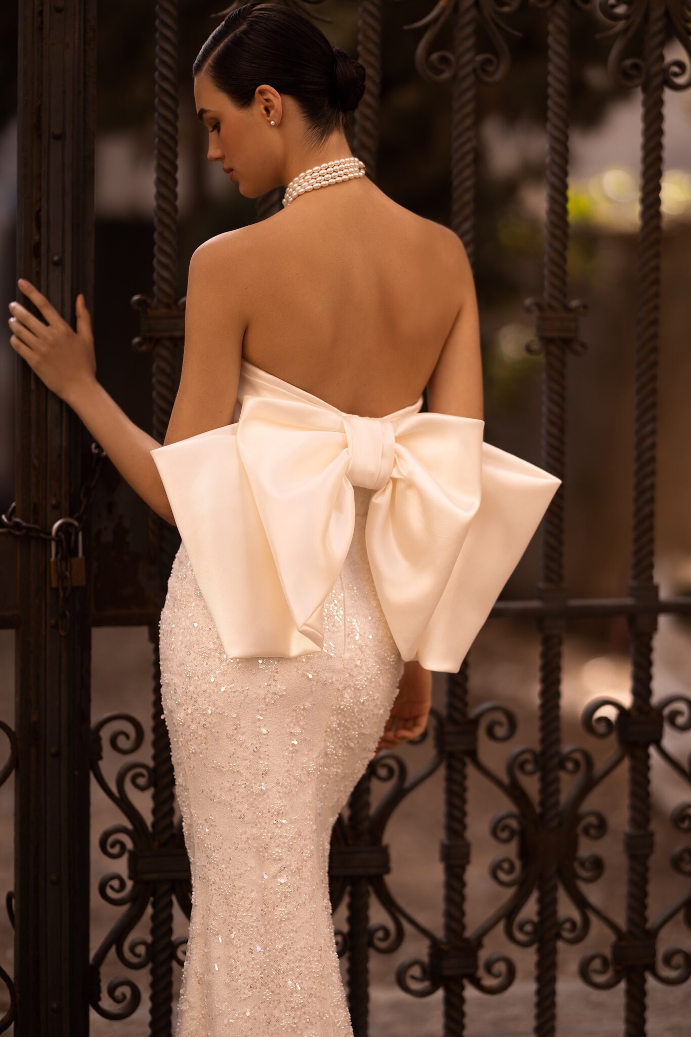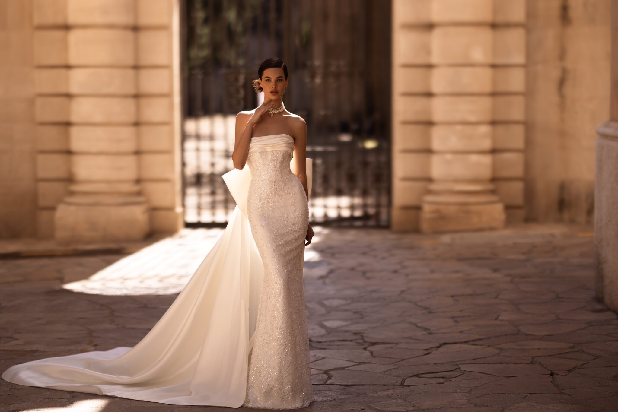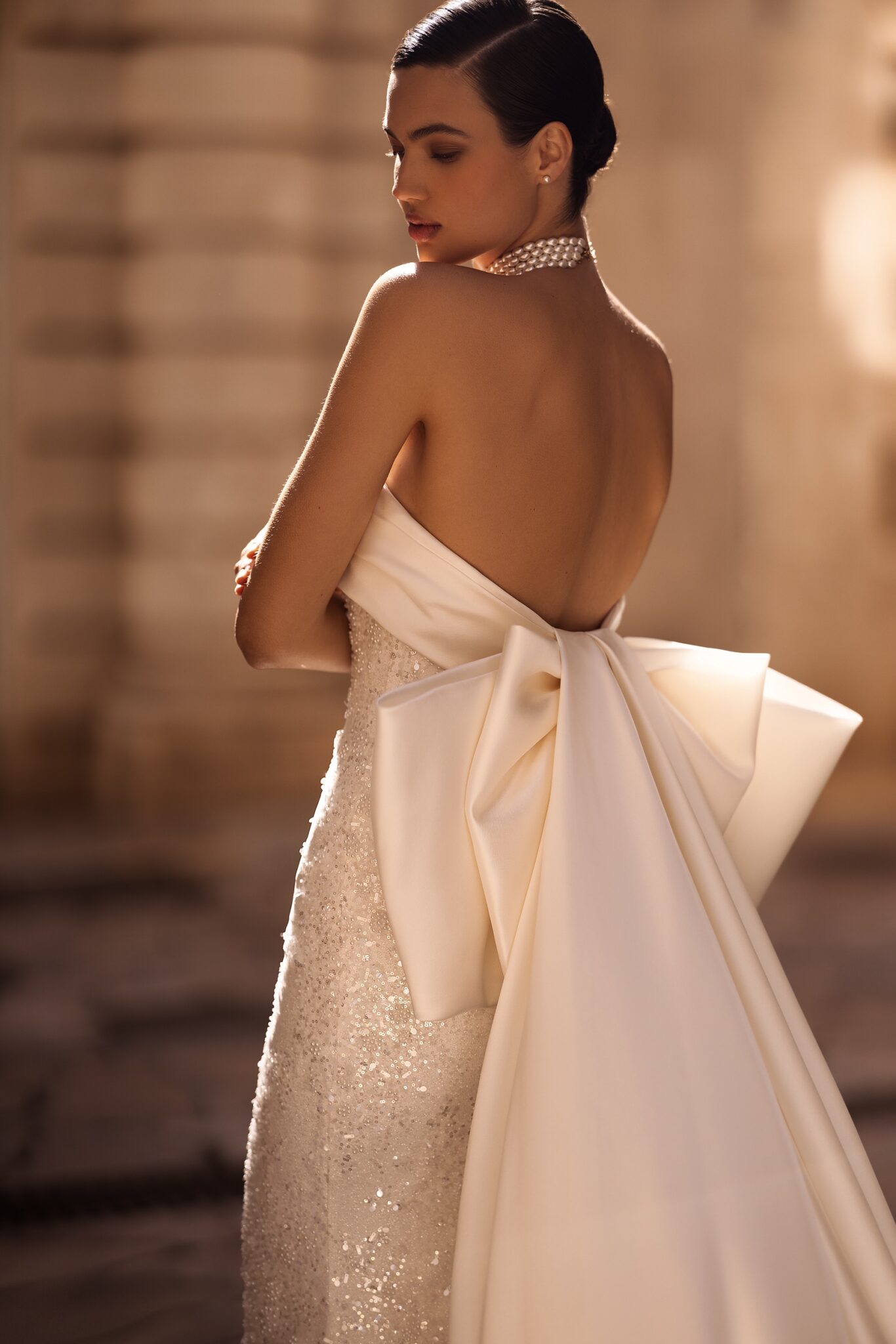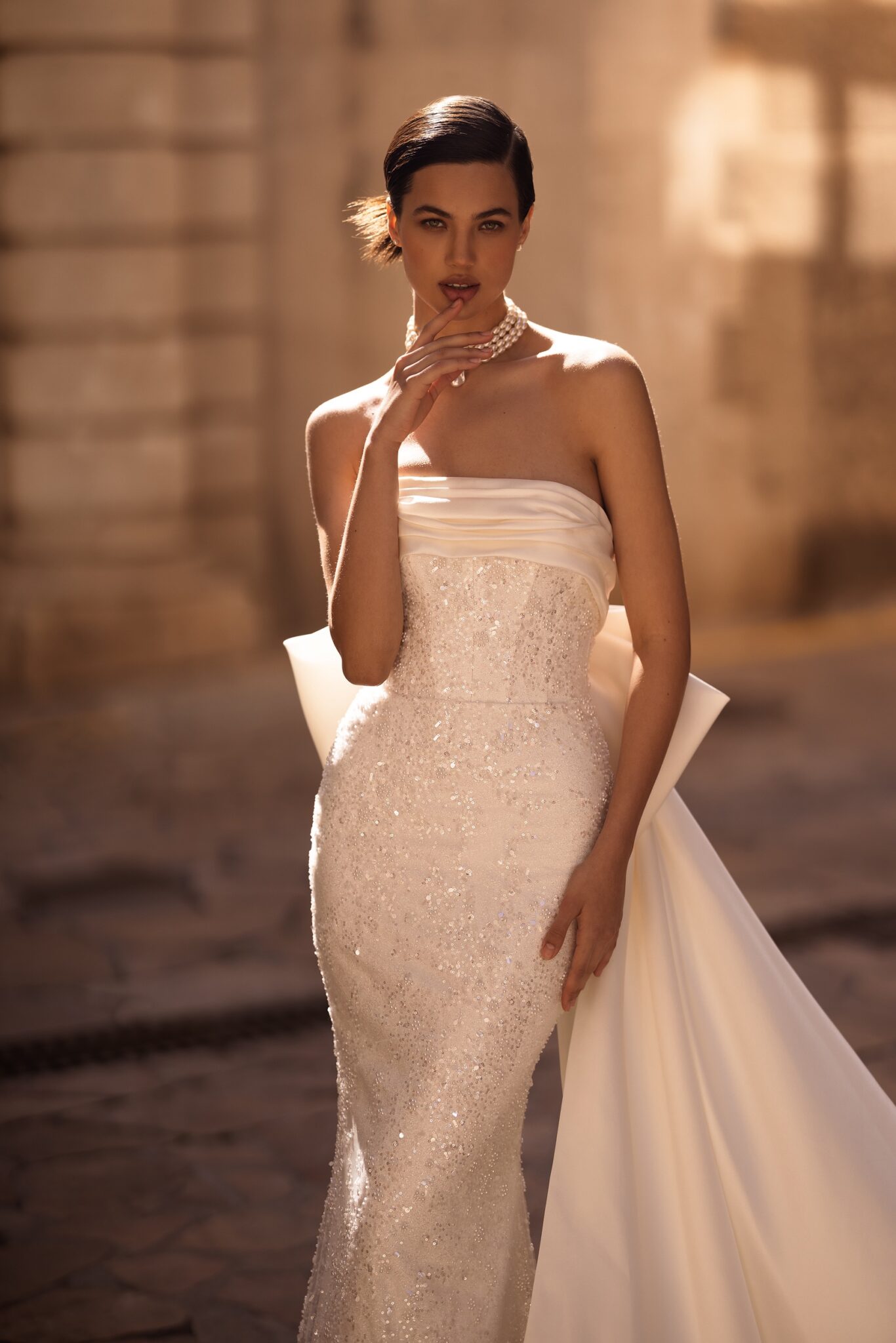 Alma de OroIntroducing our mesmerizing mermaid wedding dress, a true embodiment of glamour and sophistication. This exquisite gown is lavishly adorned with shimmering sequins, creating an enchanting play of light and sparkle. The strapless corset boasts a chic straight across neckline, beautifully accentuating your décolletage. Adding an air of elegance, the corset is expertly draped with luxurious mikado fabric on the top, creating a captivating visual texture and volume. To elevate the drama, a detachable mikado cape is fixed at the waist, decorated with a statement-making big bow. The cape cascades gracefully, exuding a regal aura as you glide down the aisle. This mermaid wedding dress is a perfect fusion of modern style and timeless elegance, designed to make you feel like the epitome of grace and beauty on your special day.