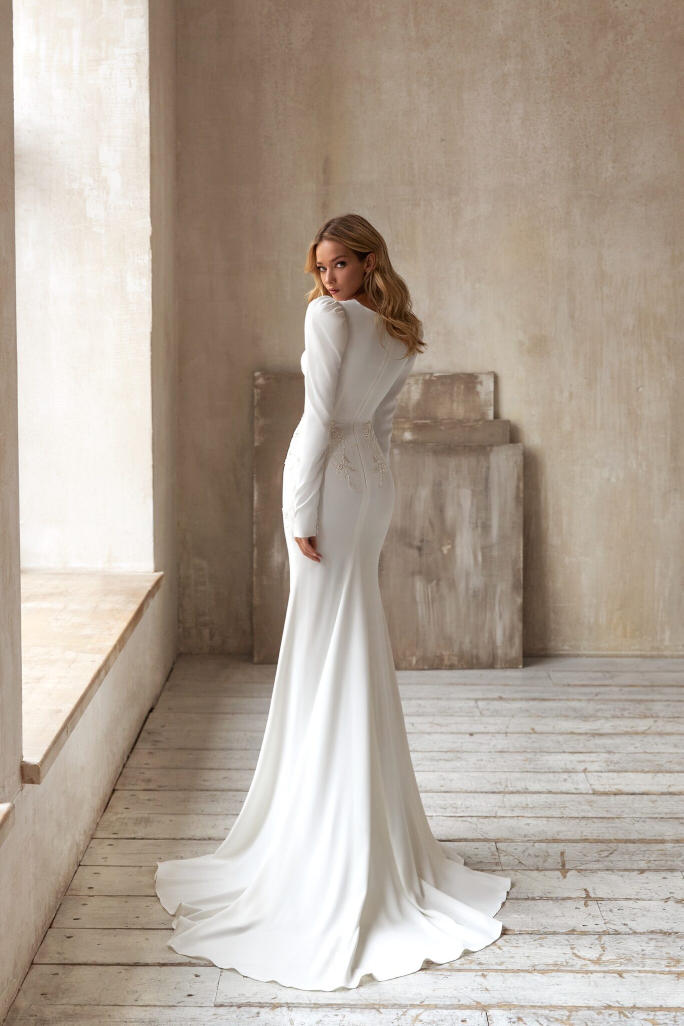 Less is more 2021Selest is a mermaid wedding gown with a splendid design. The dress is decorated with a V-shaped low neck. Long loose sleeves are decorated with tiny Buttons. From breasts to waistline the dress is embellished with embroidery. Flowers and leaves are decorated with beads, spangles, and crystals. A skirt has a short train.