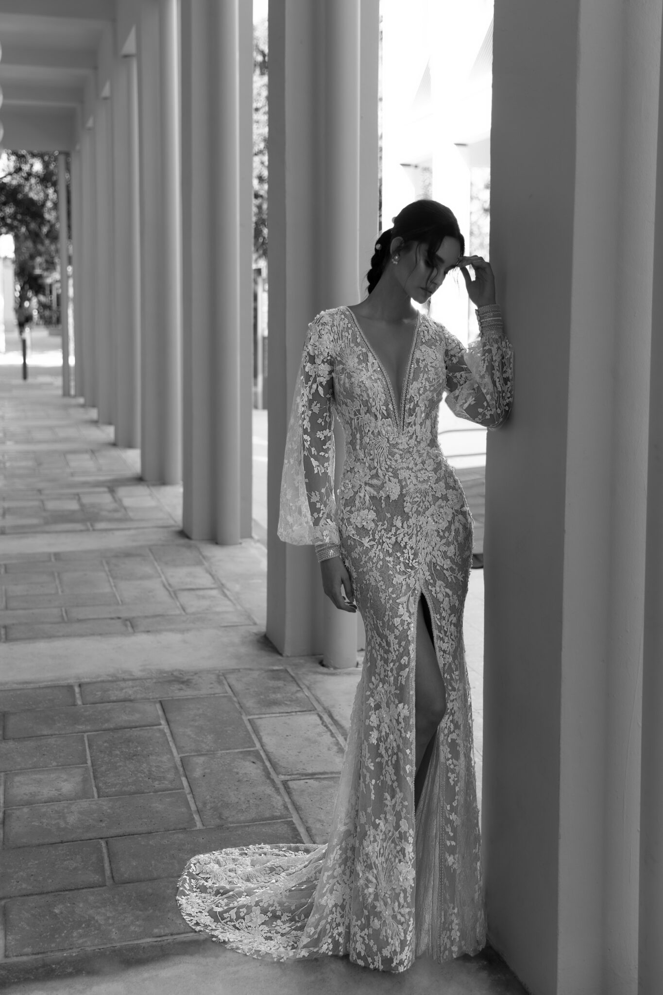 MiamiSensuella is a majestic wedding gown that is made of lace. A sheath dress is embellished with floral motives. There are long extensional sleeves. A V-shaped low neck and cuffs are decorated with beads and crystals. A fitting skirt is embellished with a deep cut and a train.