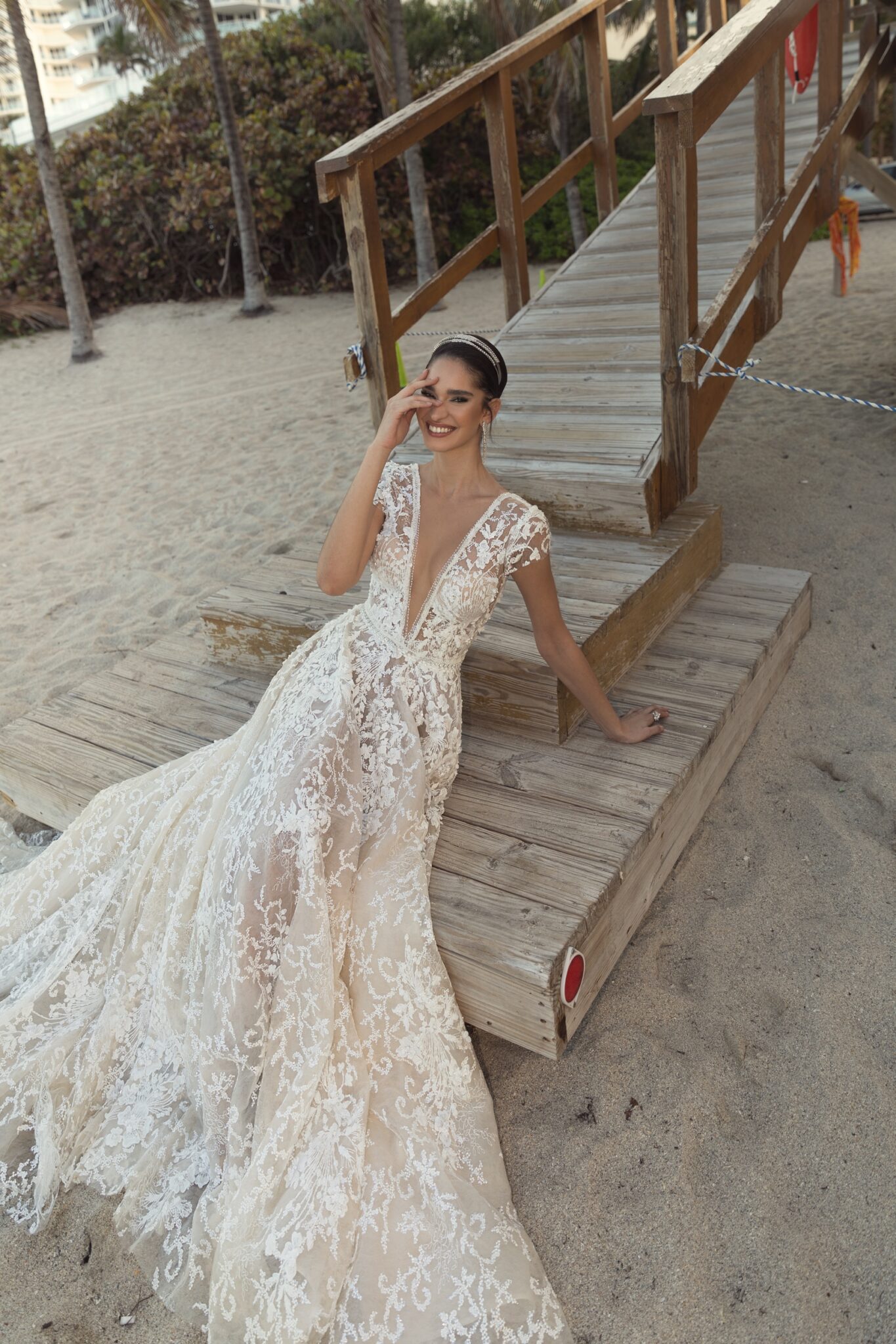 MiamiSerena is a tender A-line wedding gown. It is made of fabulous lace with a floral pattern. A dress is embellished with short sleeves and a V-shaped low neck. This low neck is decorated with beads and there is a tiny belt made of beads. A deep neckline adds elegance. A fantastic skirt passes into a long train.