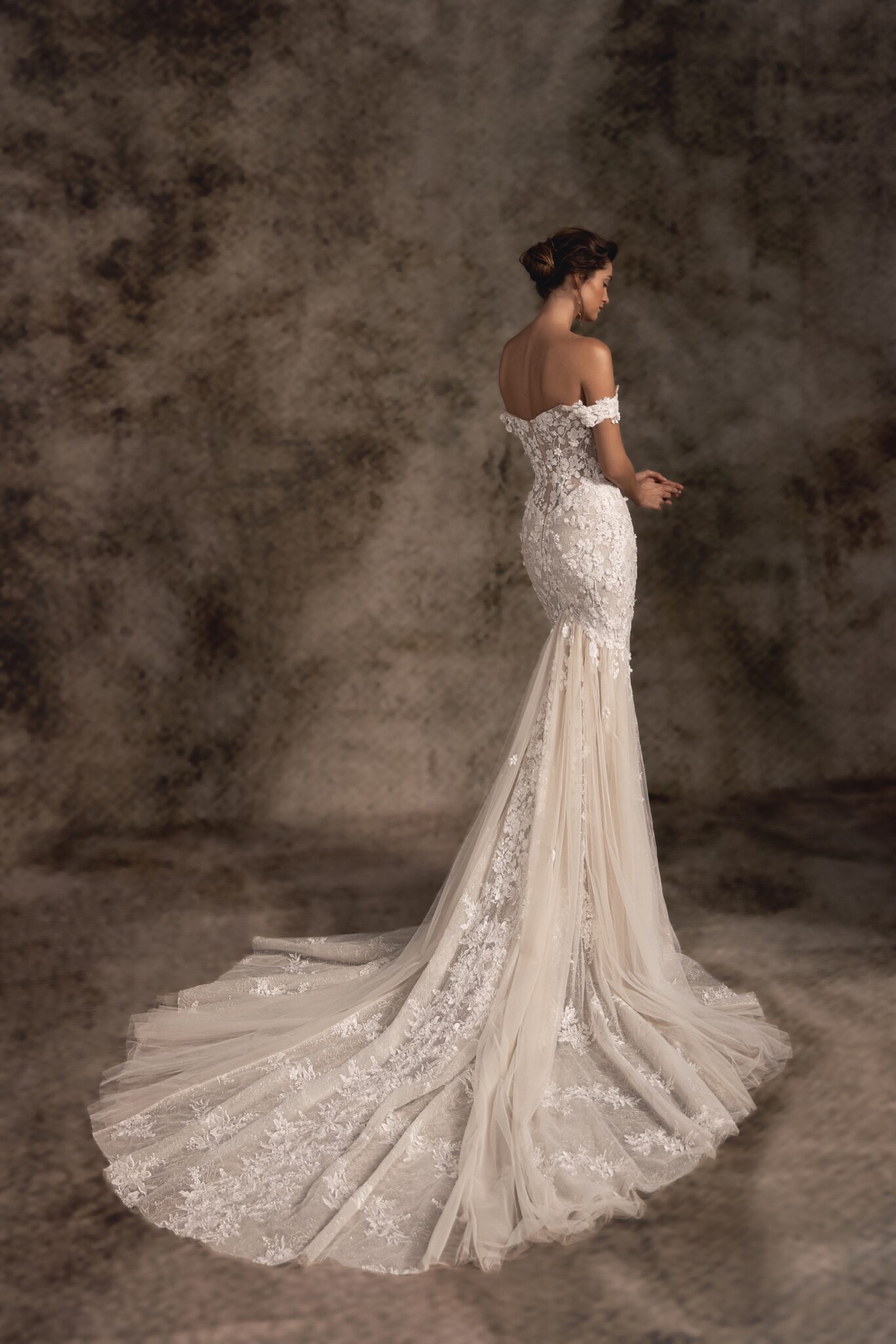 Notte d'Opera, Plus Size, Sample SaleA super-fitted mermaid wedding gown embellished with the sweetheart top with off-the-shoulder regal straps. Two-toned silk Tulle and scattered hand-embroidered floral appliques make this dress look even more elegant with soft cathedral-length Tulle train.