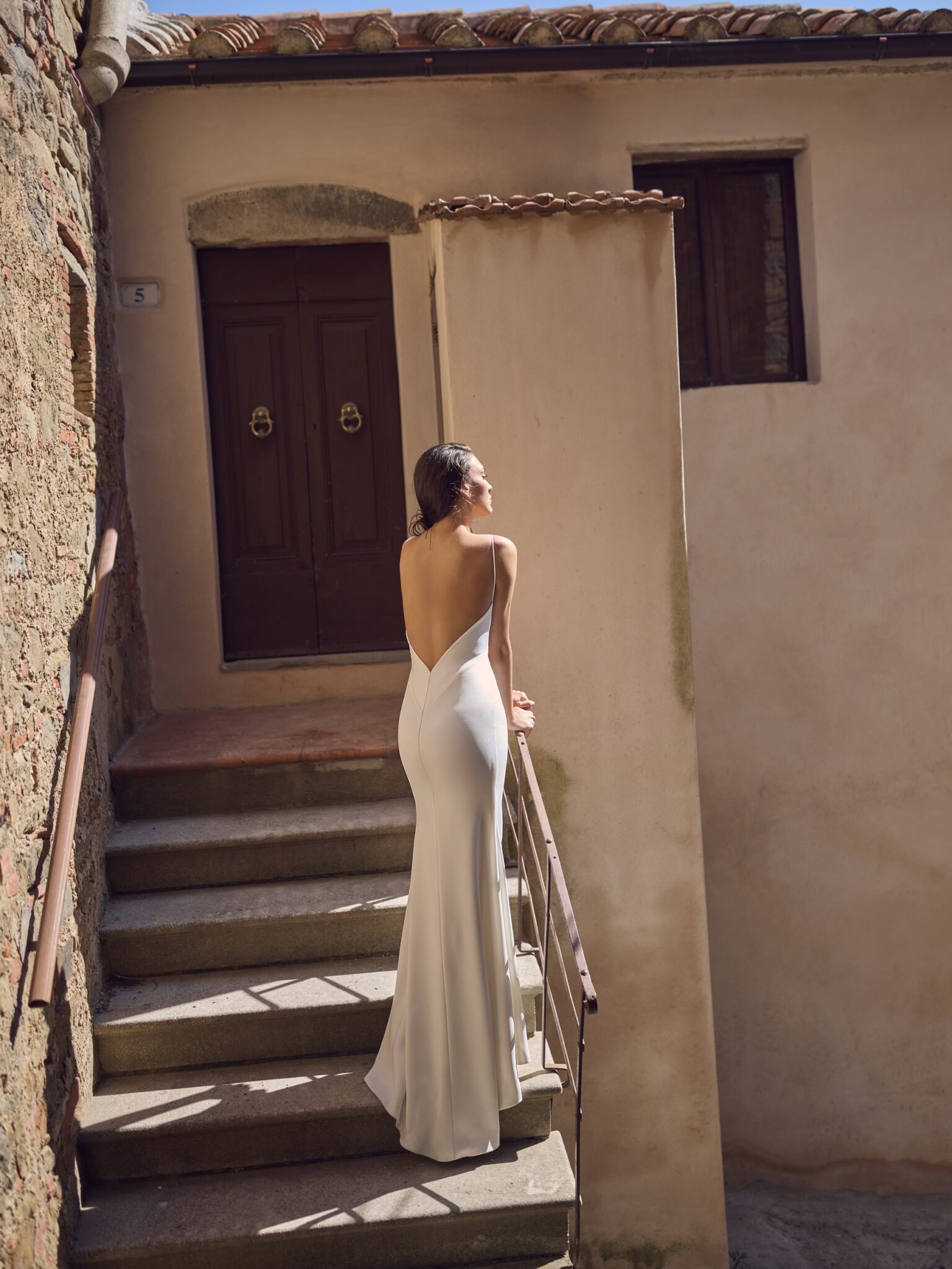 The slip dress is made from lightweight satin that elegantly flows along the body. It features a daring high slit and an open back, balanced by a subtle train that adds a graceful finish. Refined yet bold — Sparta is made for modern muses who command the room.