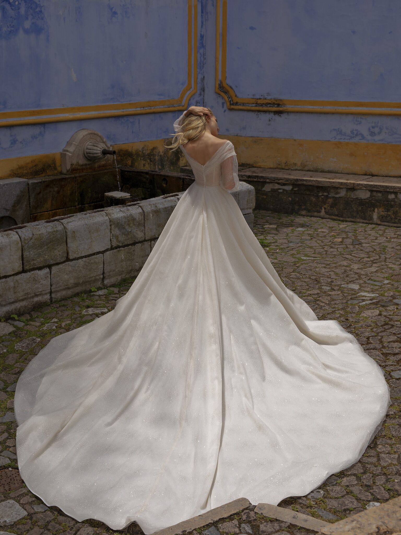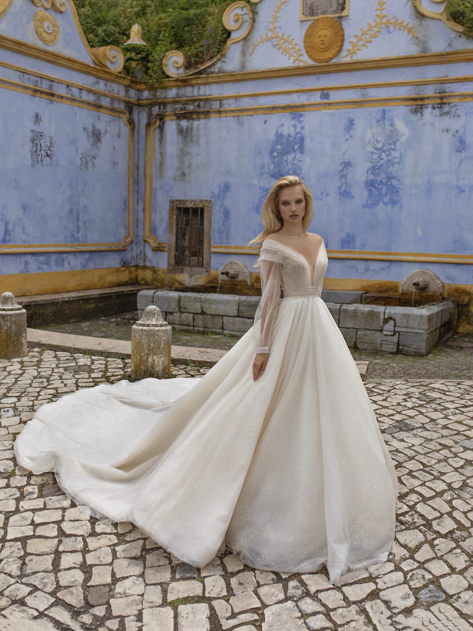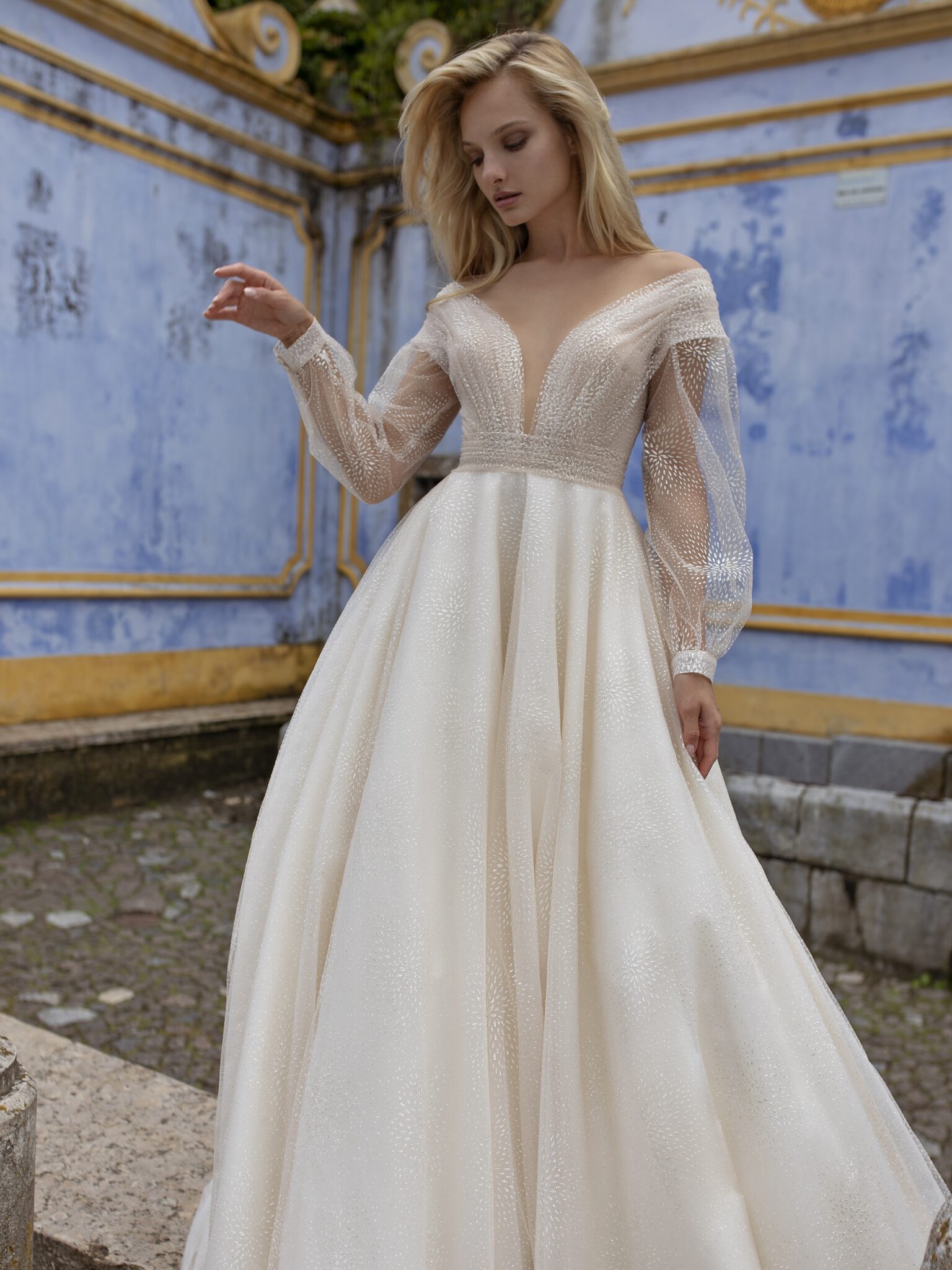Lisbon VibesA-line Spell wedding dress is made of high-quality fabric. Hug shoulder runs into a big neckline at the back of a dress. Long sleeves are decorated with lace and sheer insets. A tail gives the finishing touches.