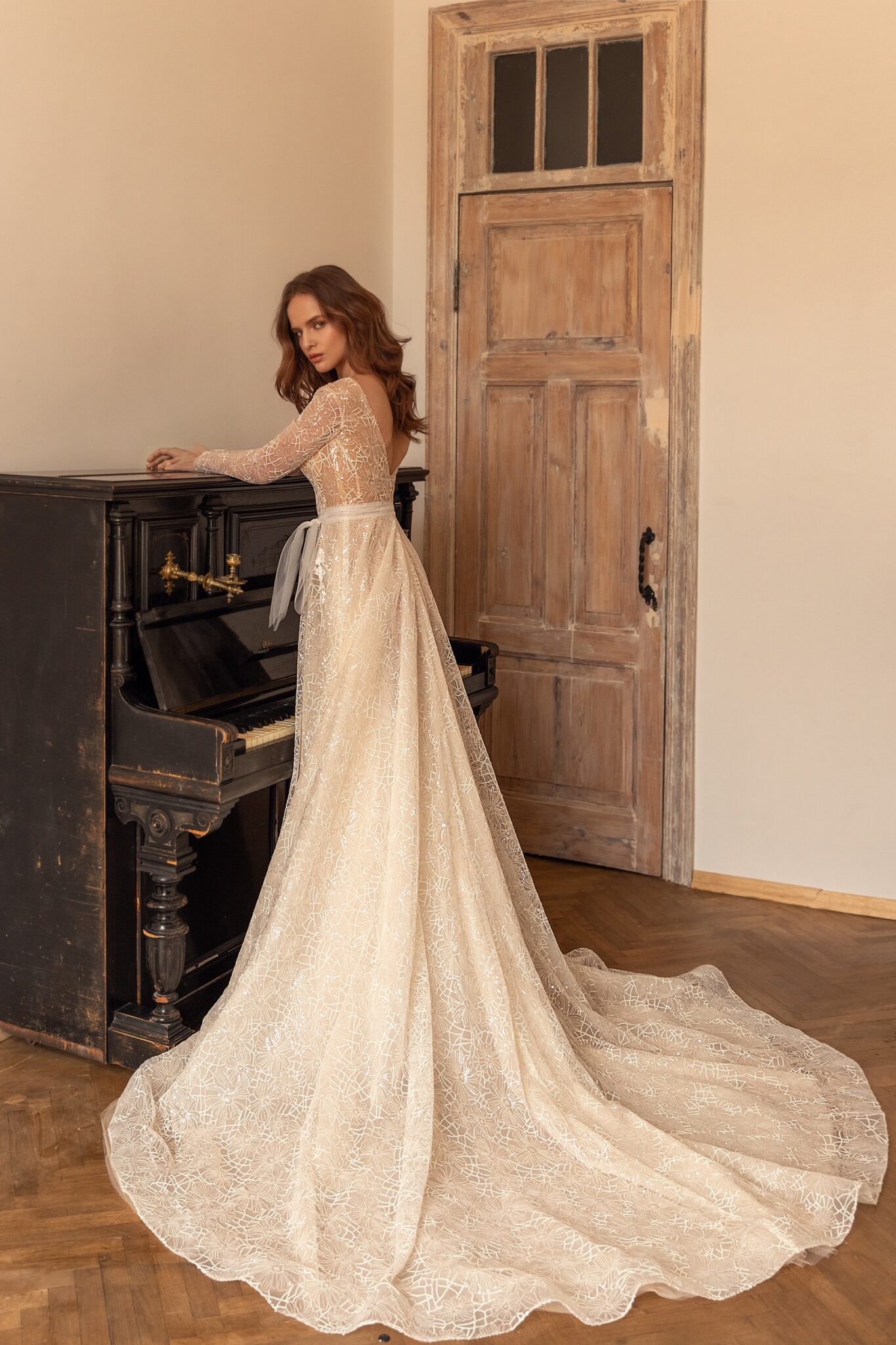Less is more 2022Suzi is an entirely sparkling wedding gown. The sheath A-line silhouette dress is made of shining lace with a cobweb pattern. The dress is embellished with a deep V-shaped neckline and long sleeves of the same fabric. The waistline as well as the tight sleeves is decorated with floral lace, beads and crystals. A fantastic A-line skirt passes into a wonderful long train.