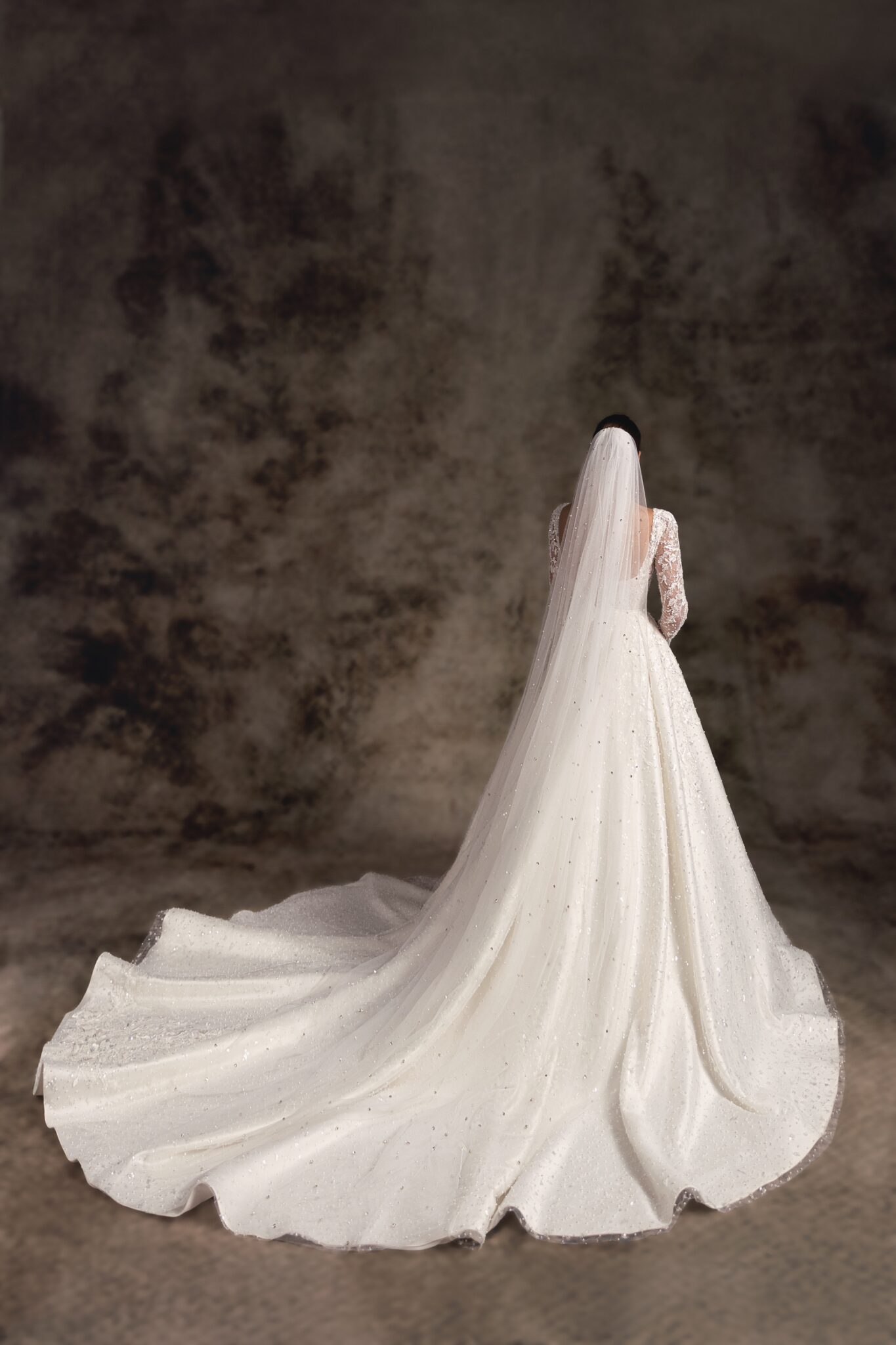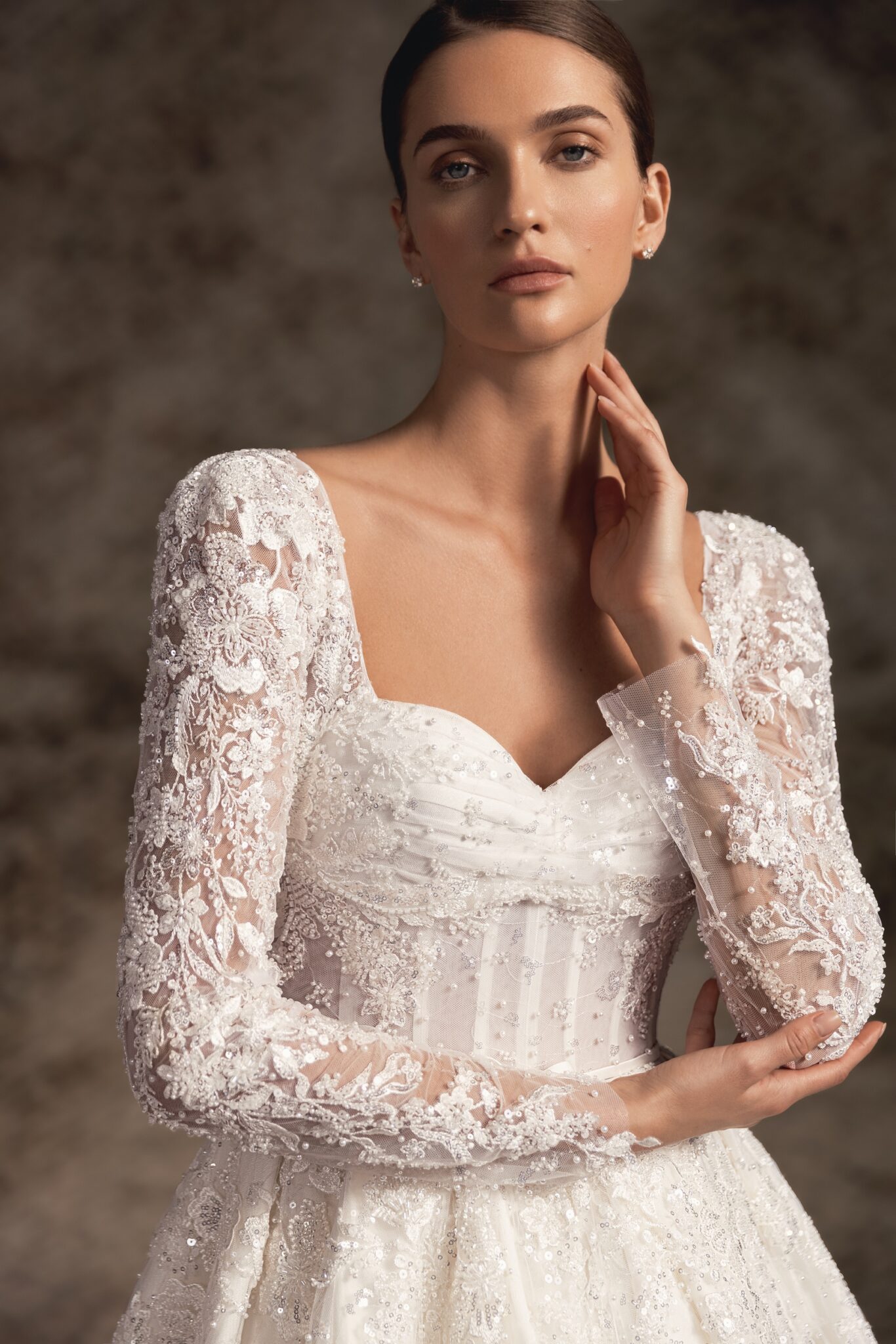 Notte d'Opera, Plus SizeAll embroidered lace wedding gown with sheer square neckline and long fitted floral lace sleeves with a tatoo effect. A voluminous full skirt is decorated with mini floral embroideries with beads and sequins that trickles down into a majestic cathedral-length train.