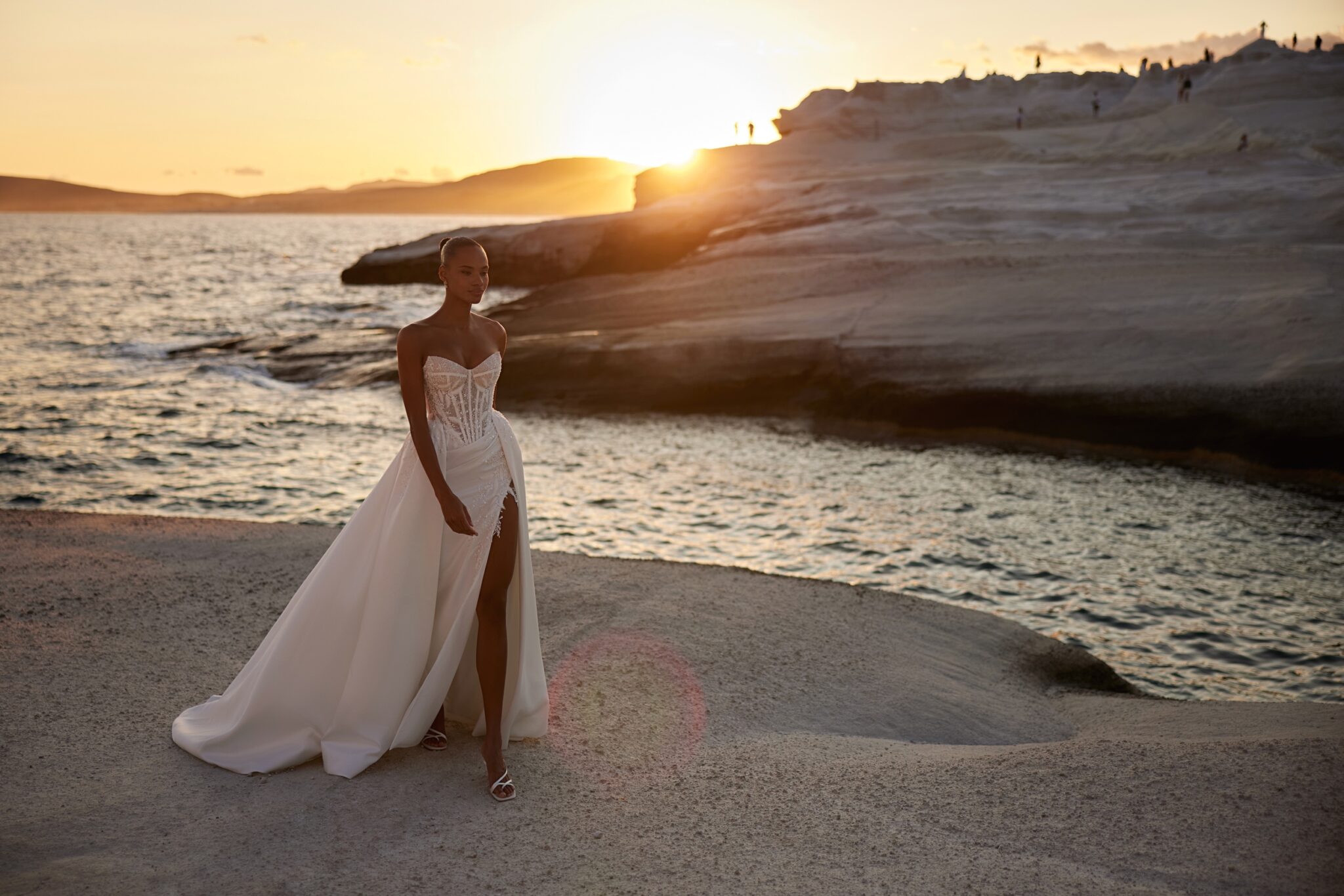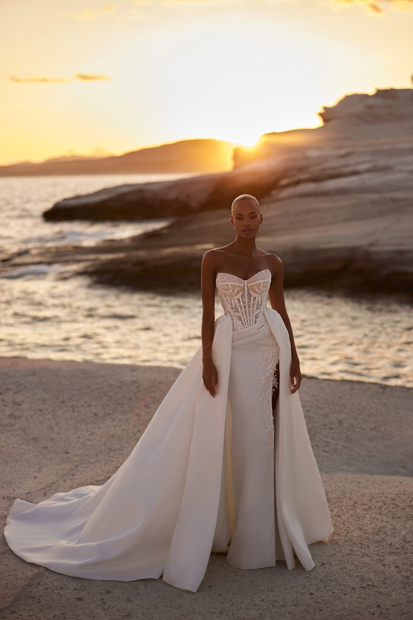 Venus, Plus SizeRefined sweetheart corset dress featuring symmetrical ornaments and beaded decorations on the top. The bold skirt features soft drapes around the waistline and a full-length slit on the left. The upper edge of the slit is delicately beaded, while the train attached to the back reflects a more classic design.