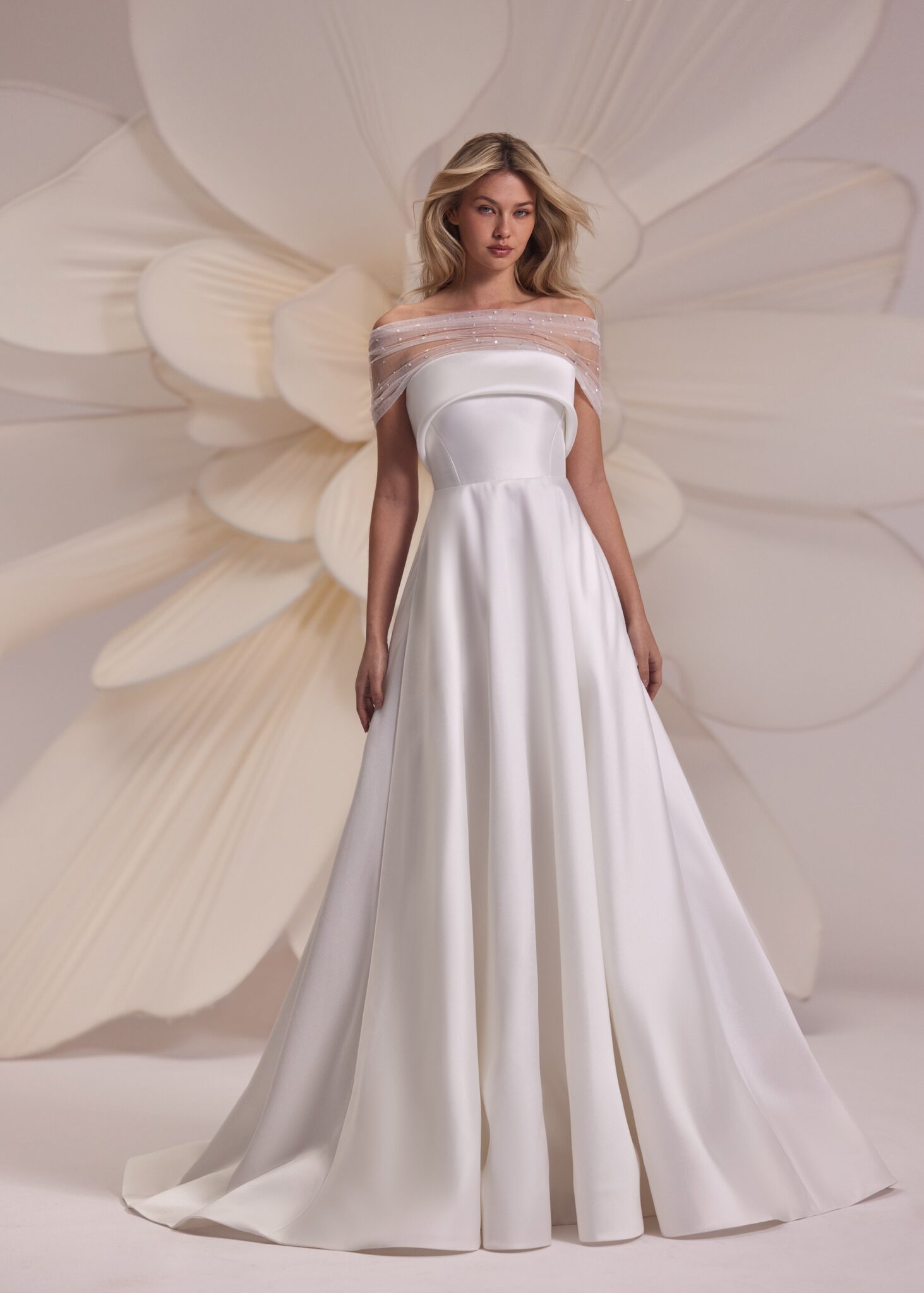 Less is More IV, Plus SizeTeya – smooth strapless A-line dress decorated with a crystal line on the back and complemented with tuille cold-shoulder bolero.