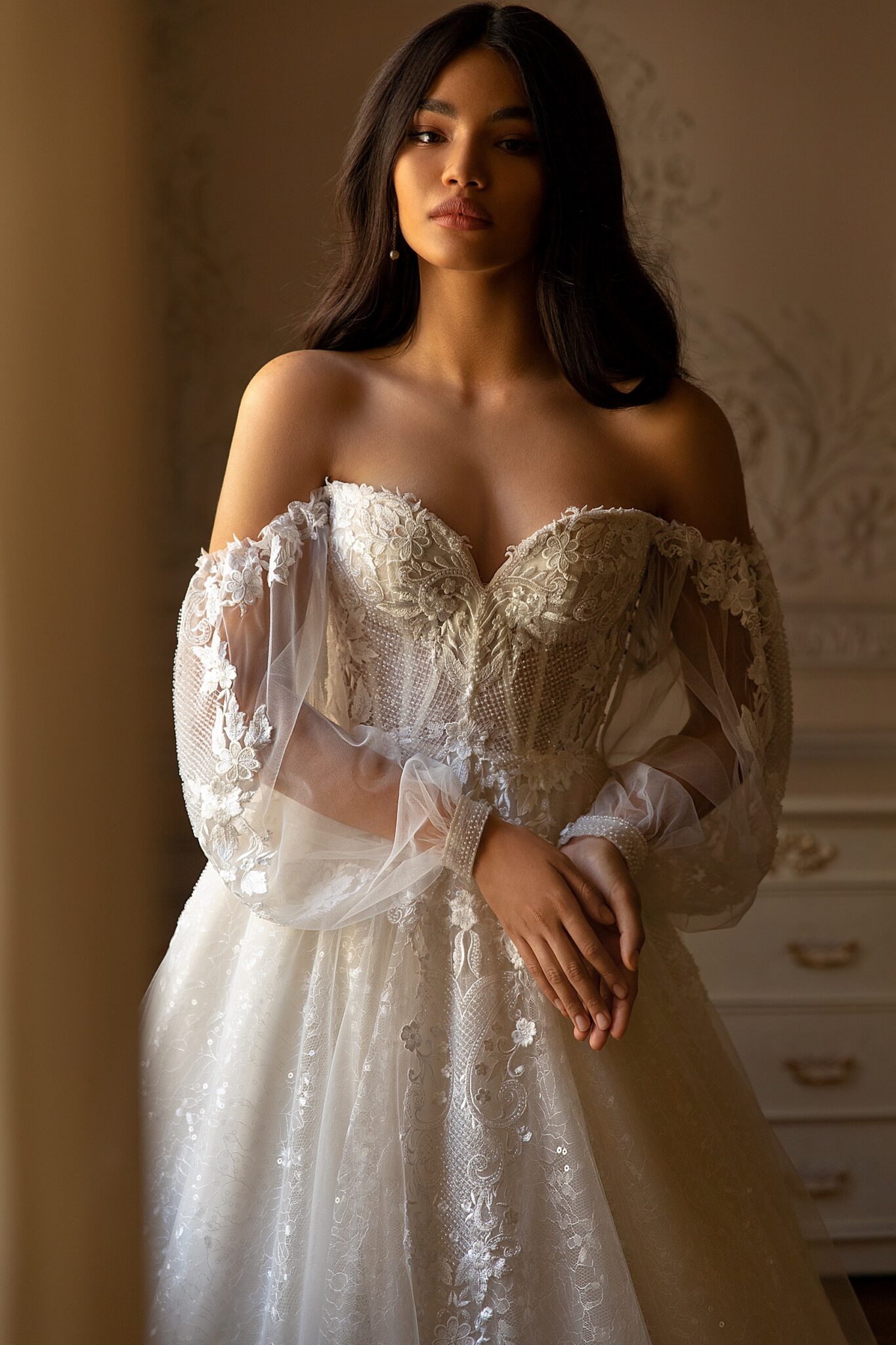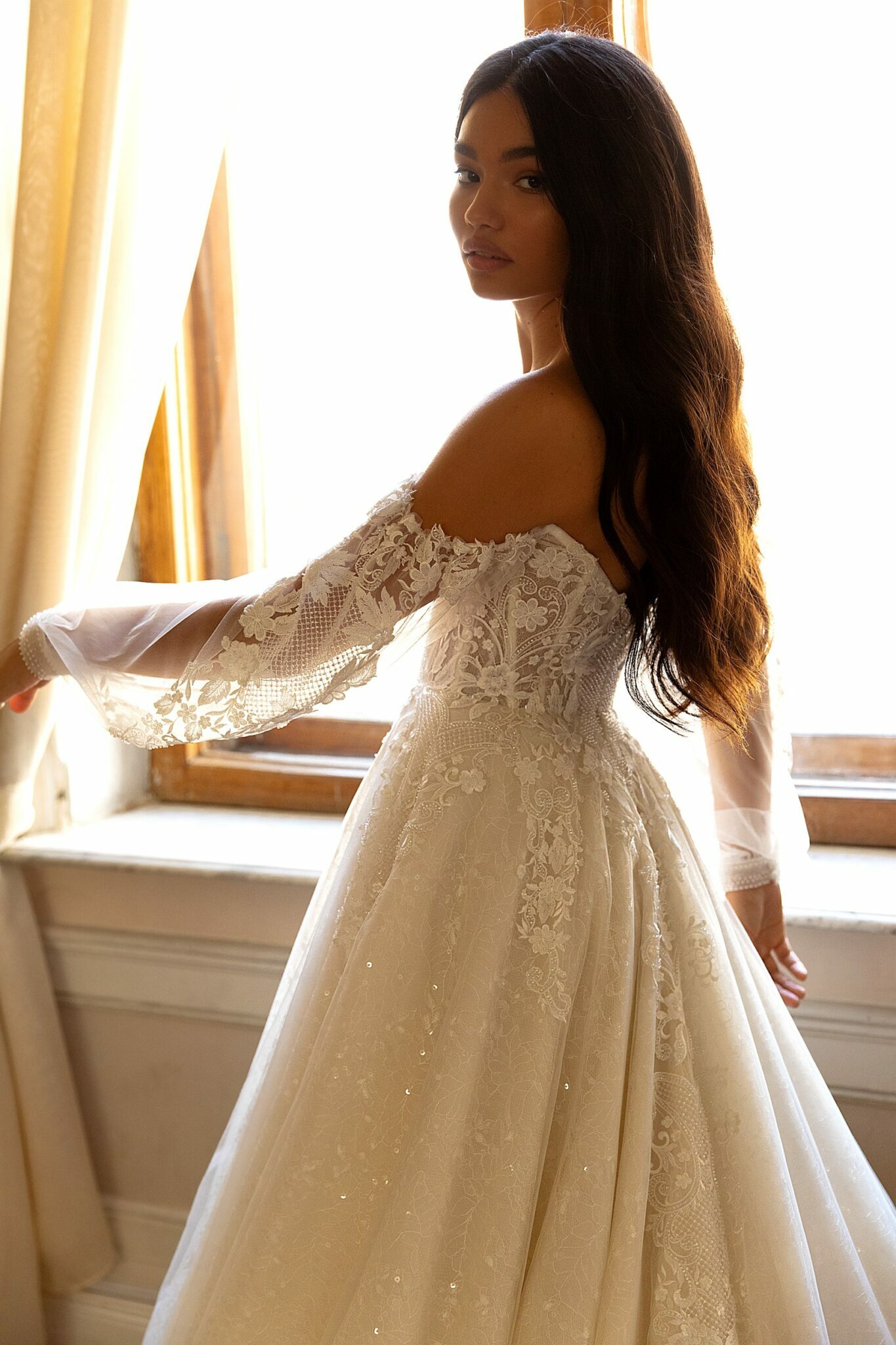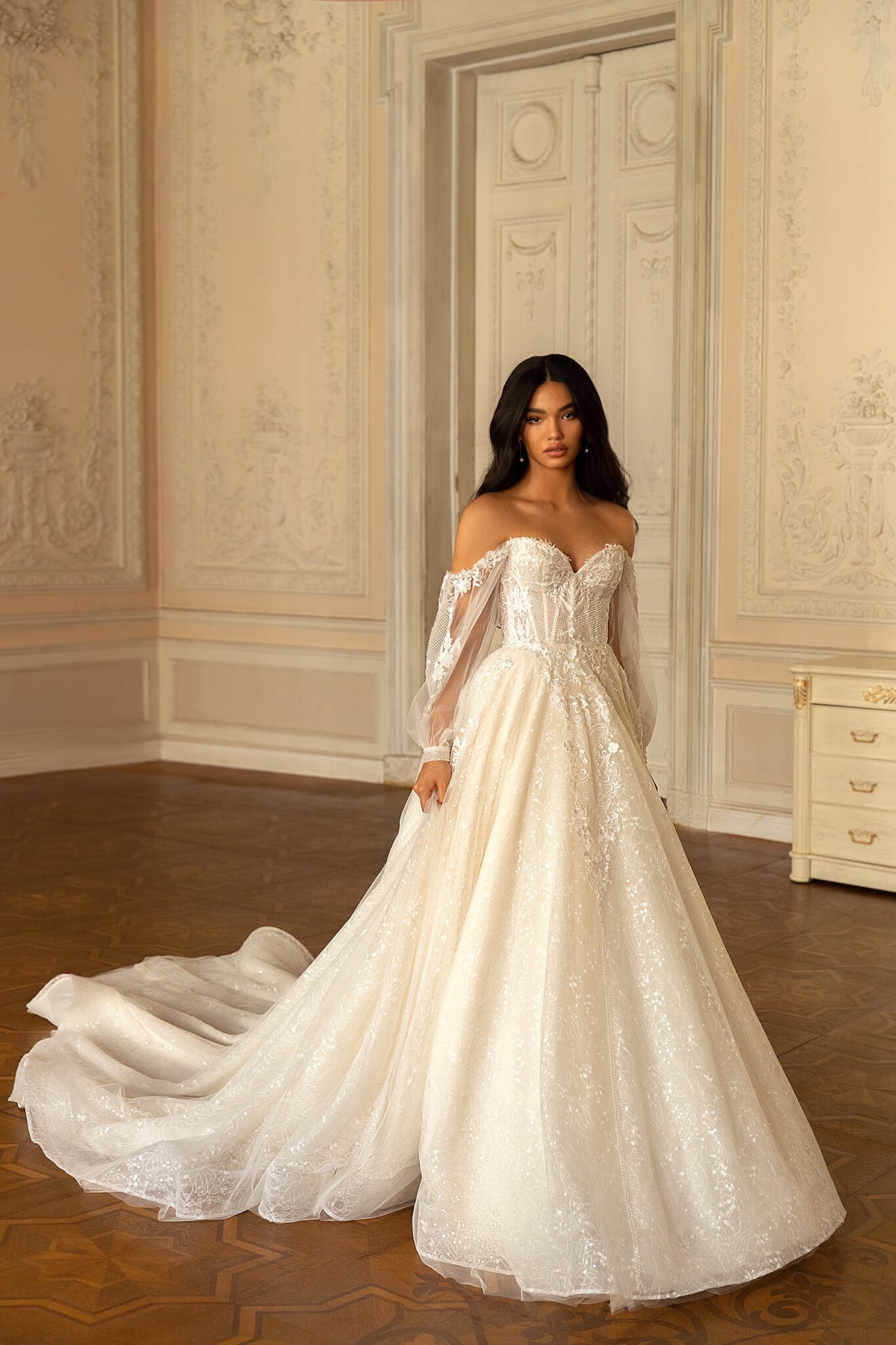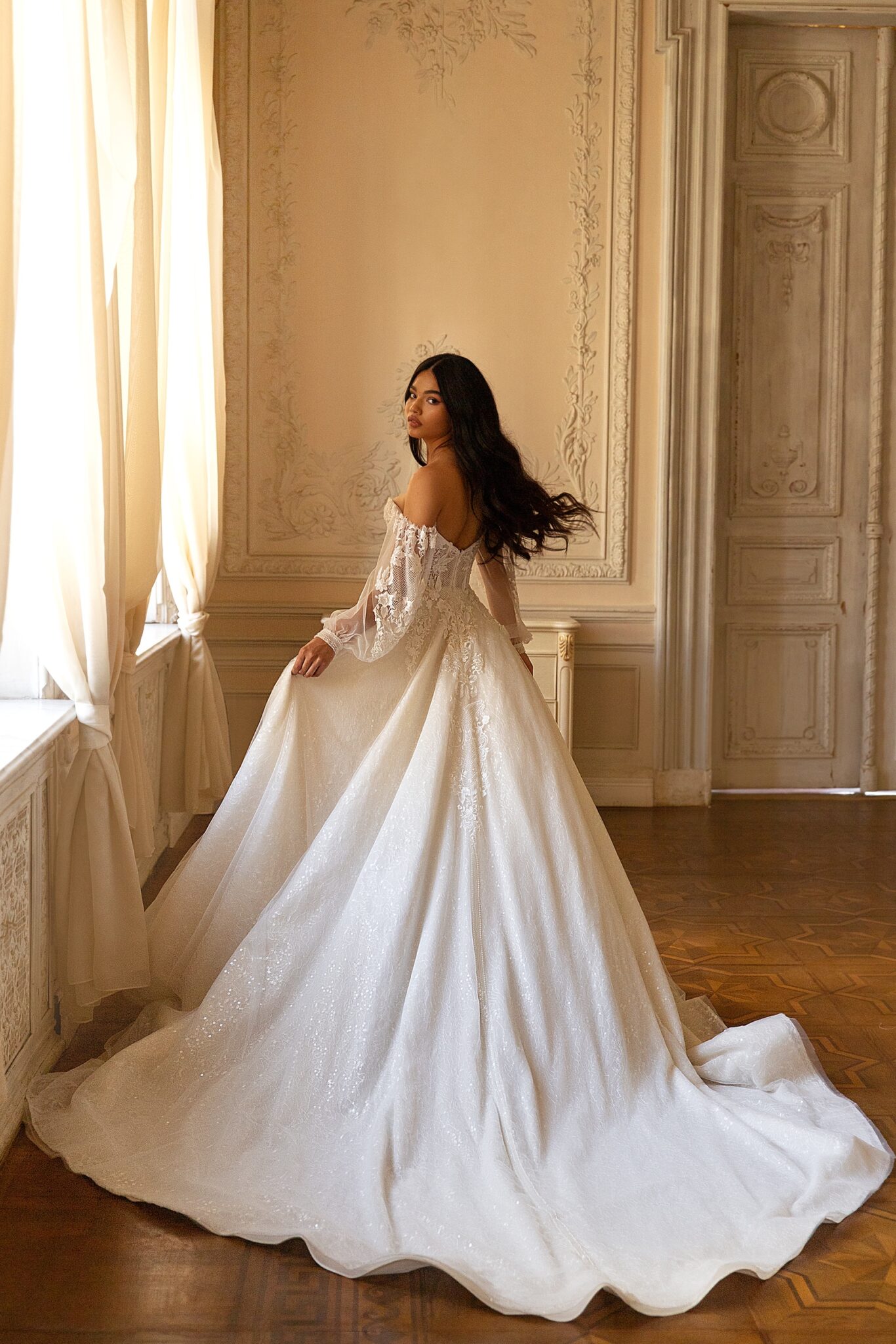 RomanceTiffany ball gown is a shining dress for a royal wedding. The bodice with lowered shoulders is made of lace with a floral pattern and embellished with a rouche. The uncovered back of the dress looks fabulous. The skirt is made of many layers of veiling and decorated with spangles. There is a long fantastic train.