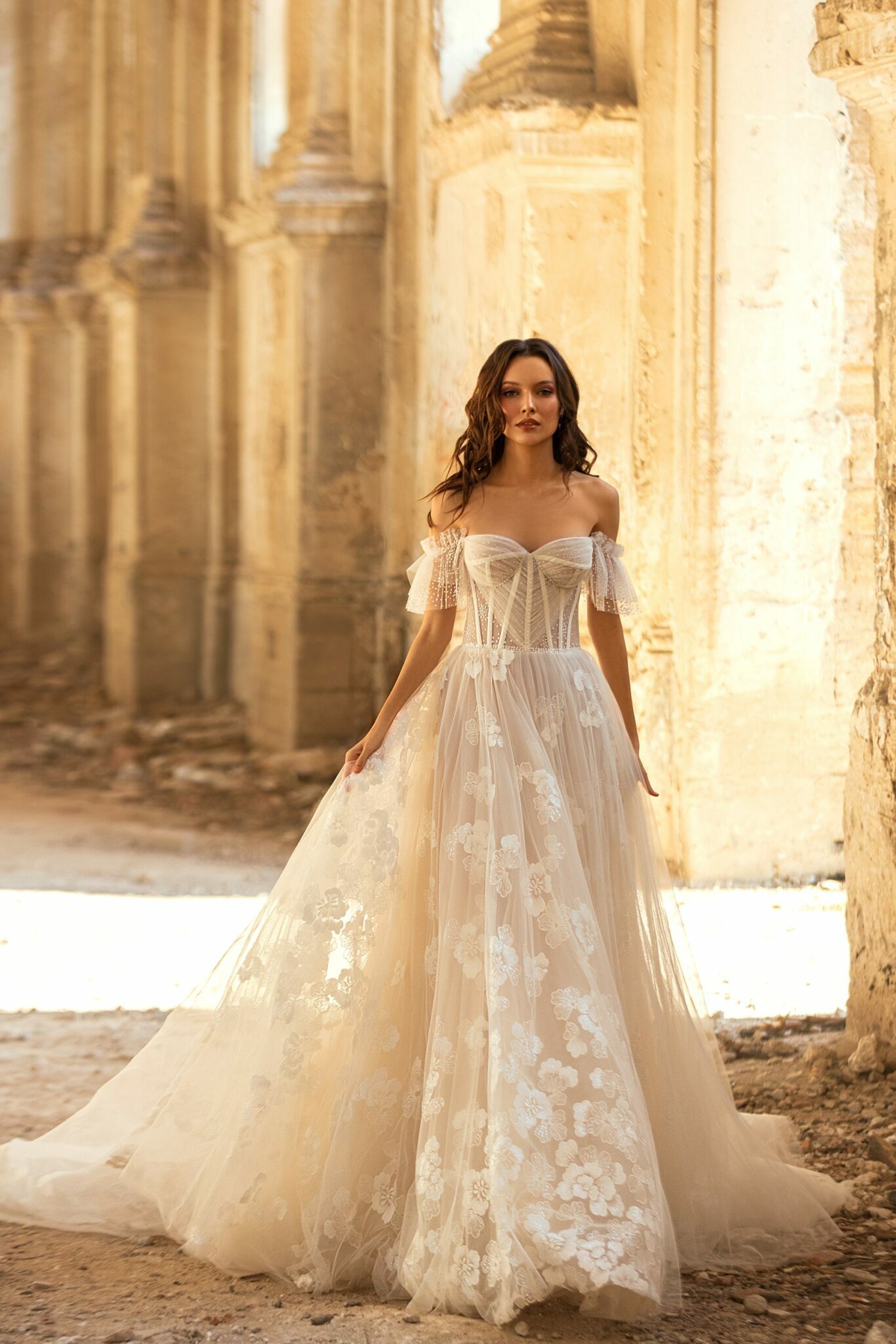 Golden HourTiziana gown is made of tile and flowery lace. This is a tender wedding dress with a sweetheart neckline and off shoulder sleeves.