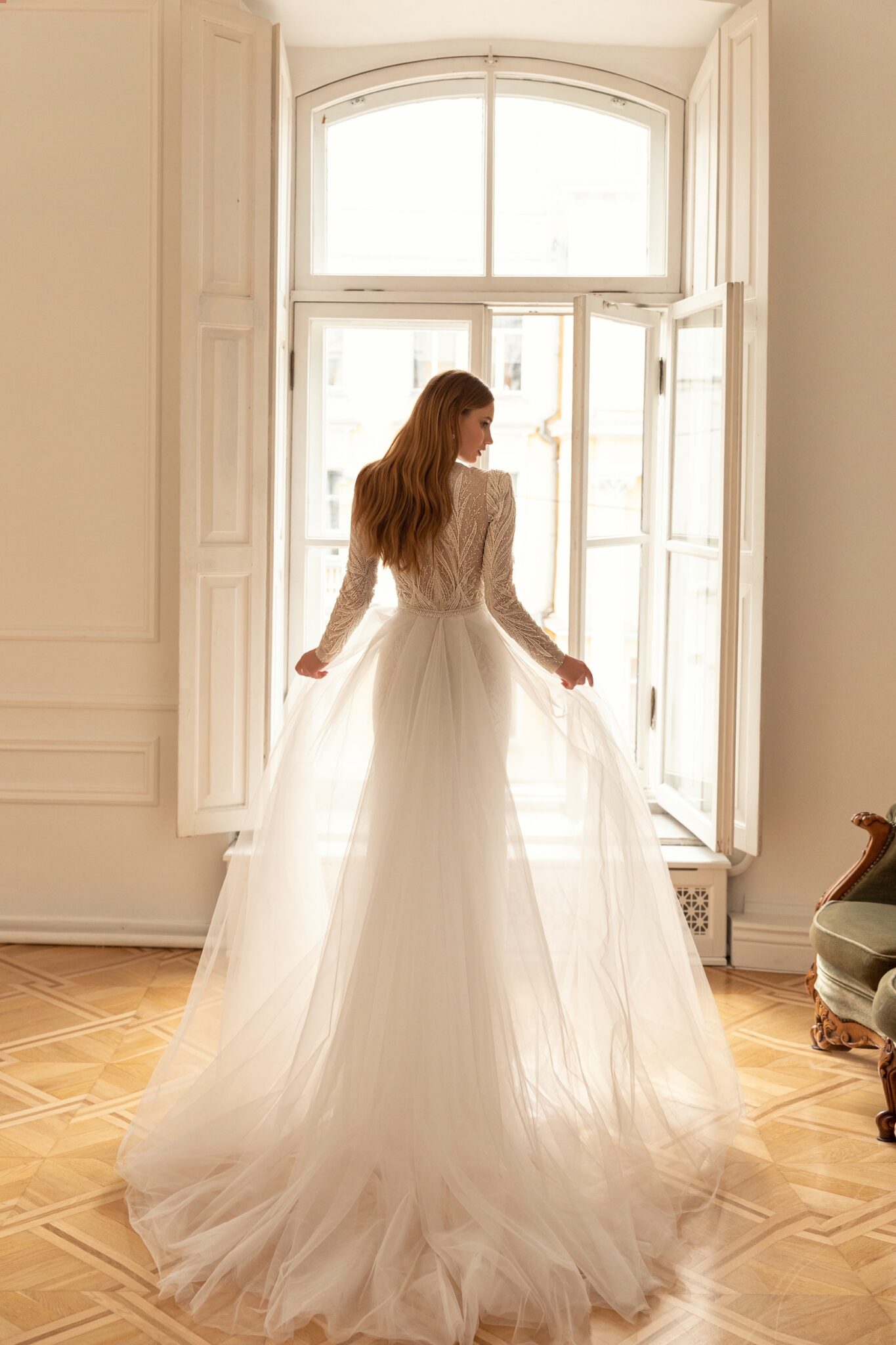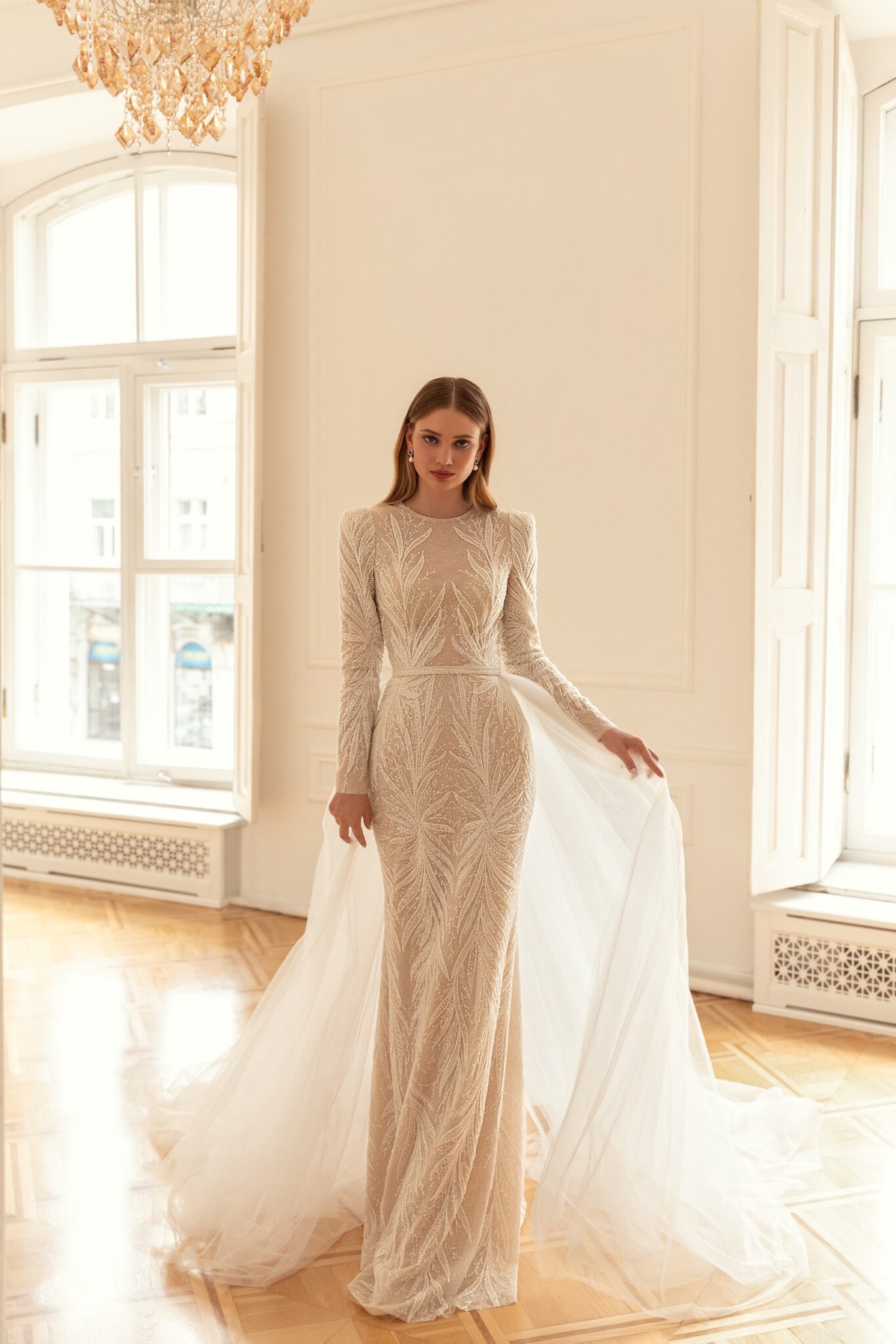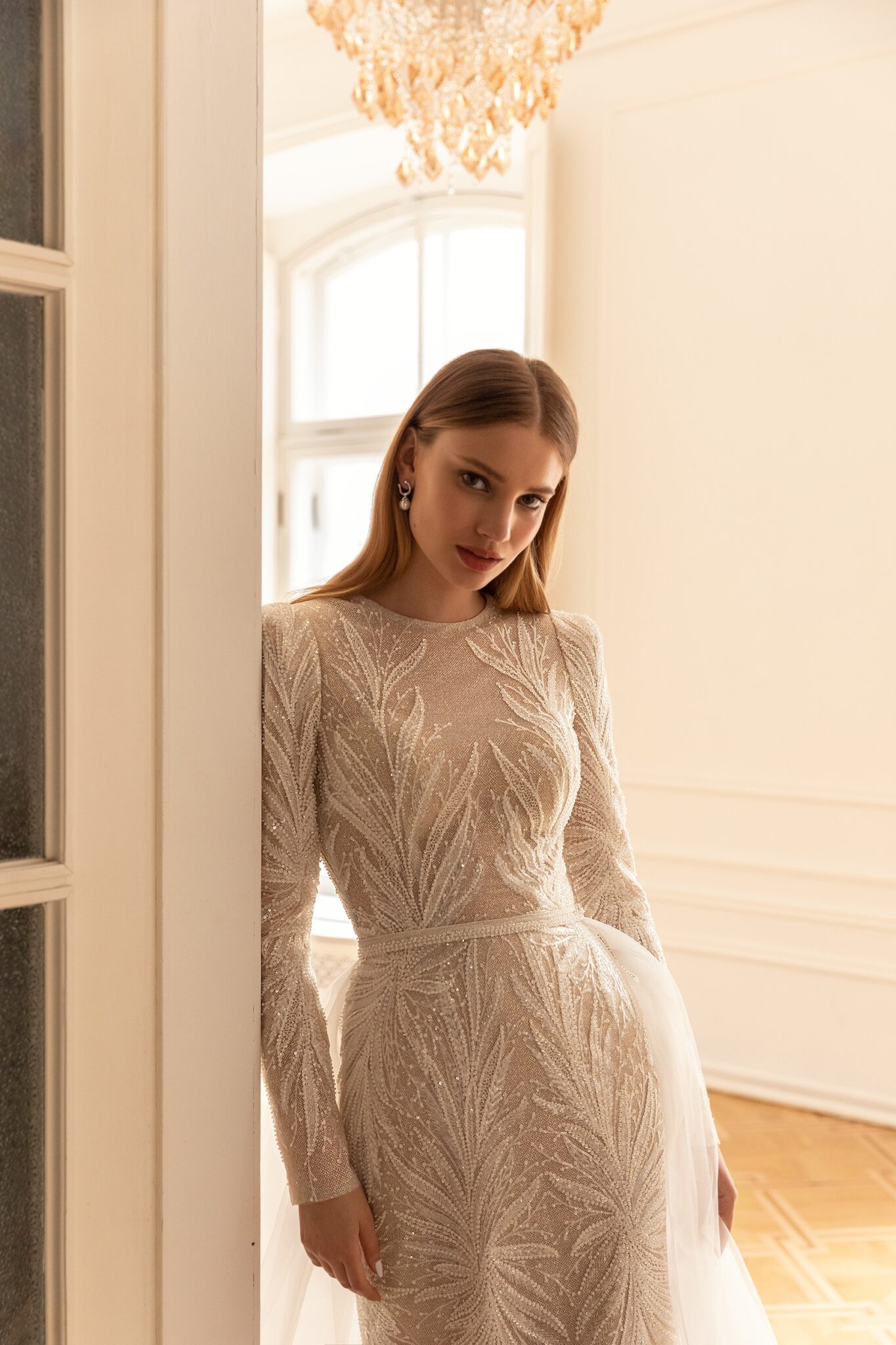 Less is more 2022Tokyo mermaid wedding dress is made of lace and veiling. A sheath dress is all embroidered with sparkling sequins with geometric and floral pattern. It is also embellished with pearls and beads. The Closed high neckline with long semi-transparent sleeves With shoulder pads makes this dress enigmatic. An additional loose skirt is made of many layers of Tulle. This additional skirt is fixed on a waistline and embellished with a belt. Gorgeous long train makes the wedding dress magnificent.