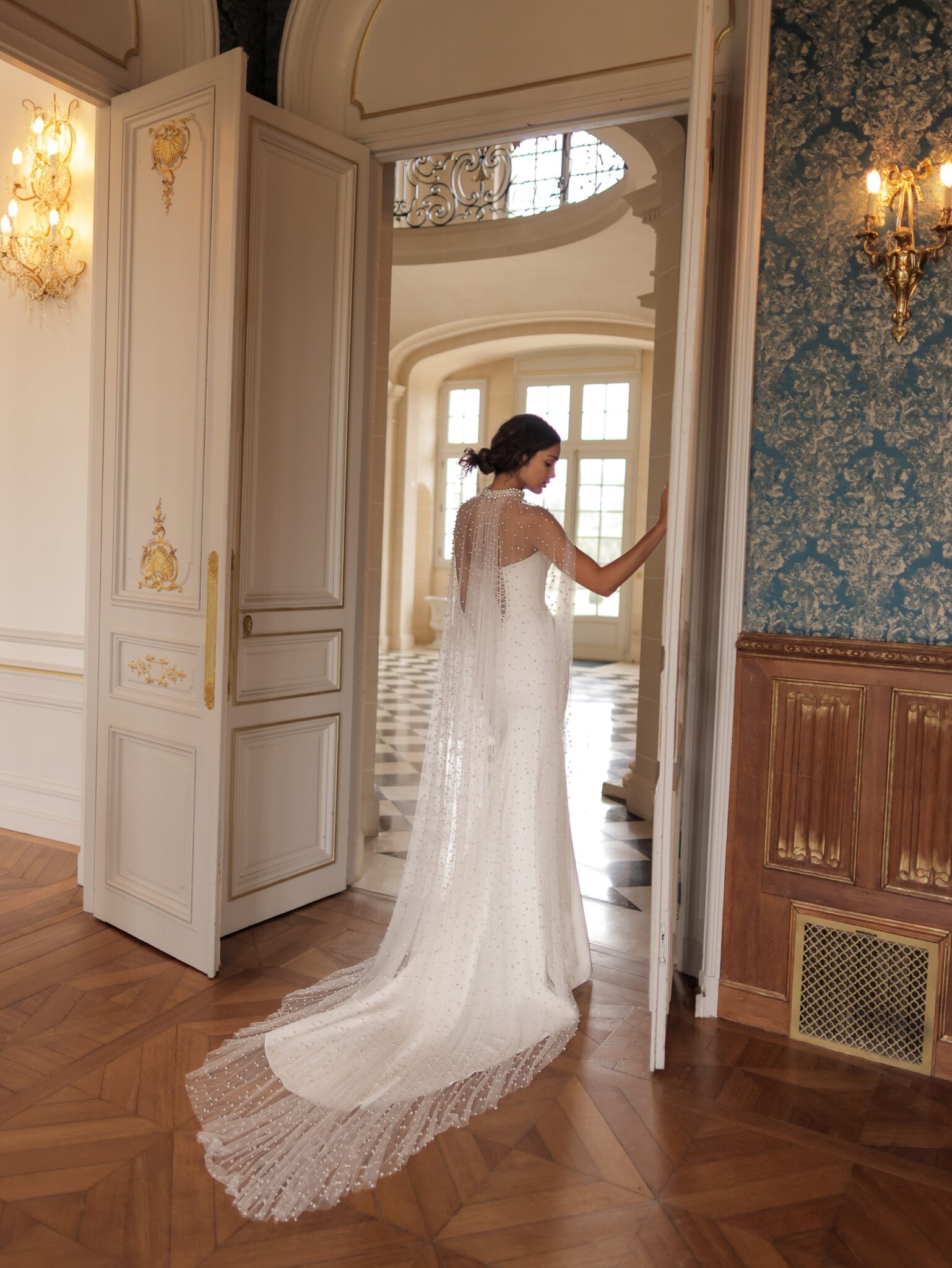 The dress is complemented with a sheer tulle veil, adorned with pearls, descending from a choker and draping over the train.
