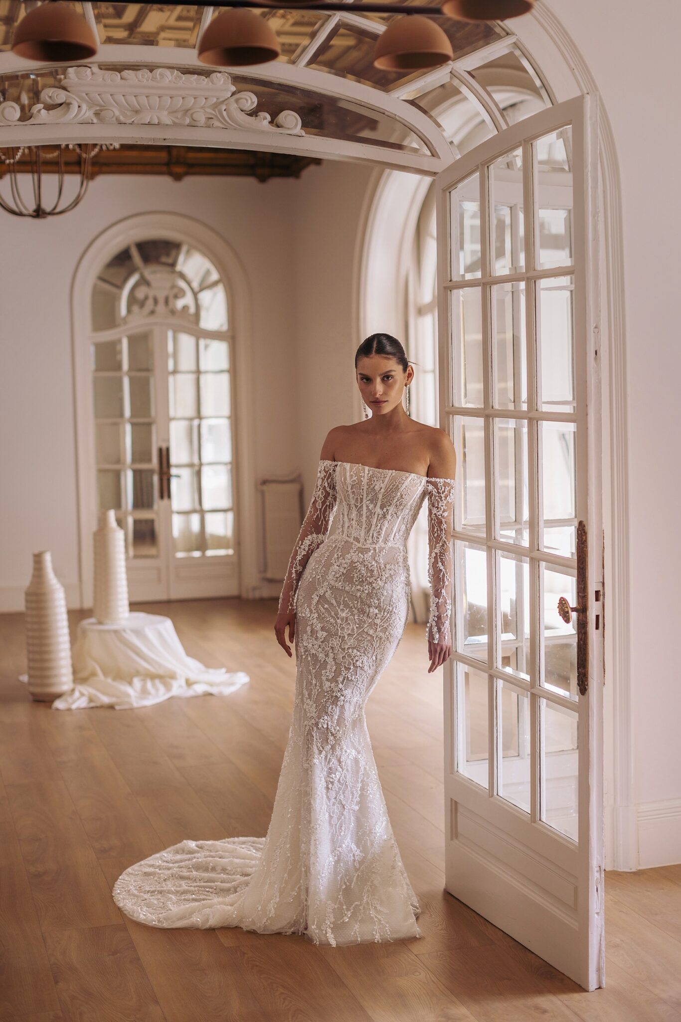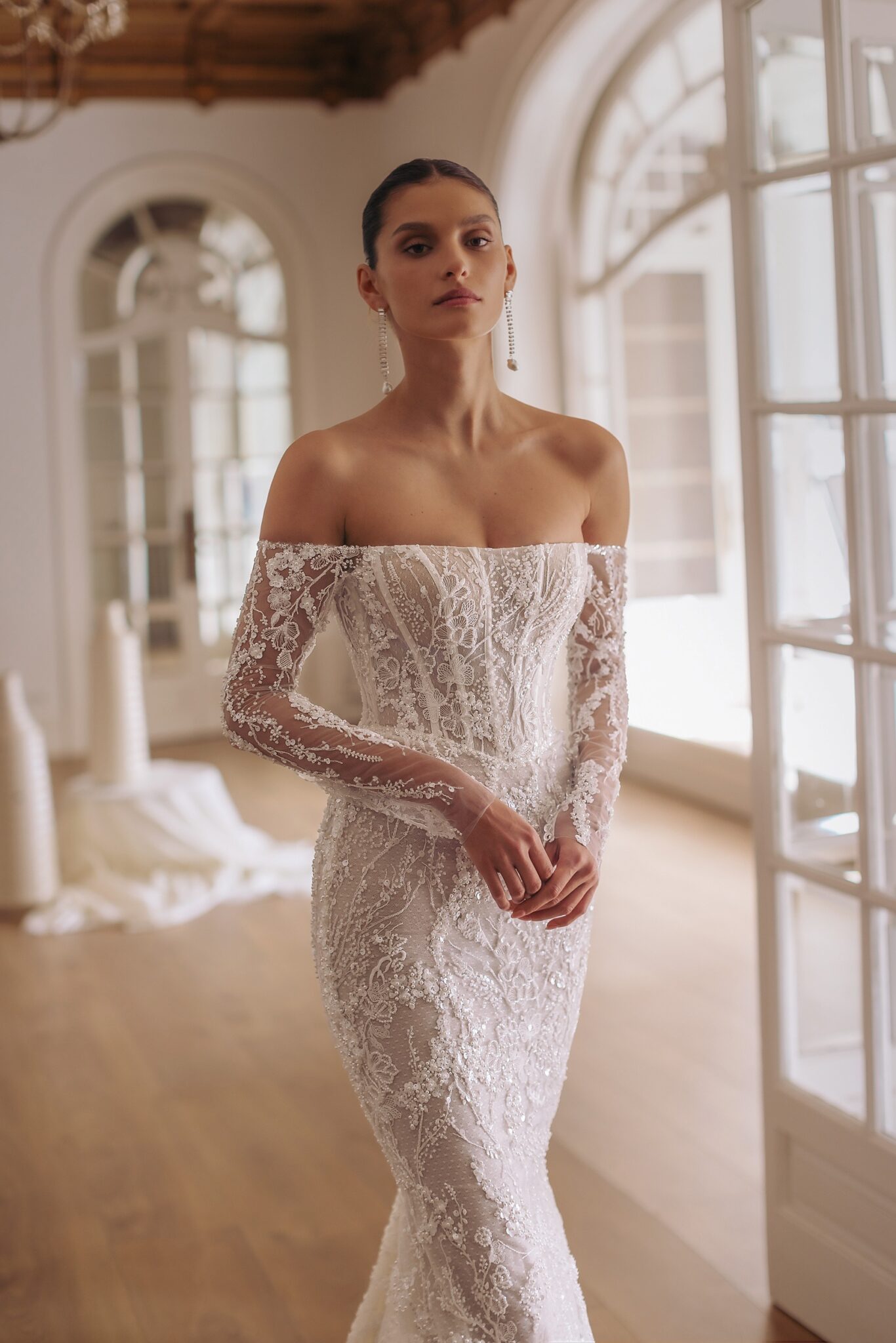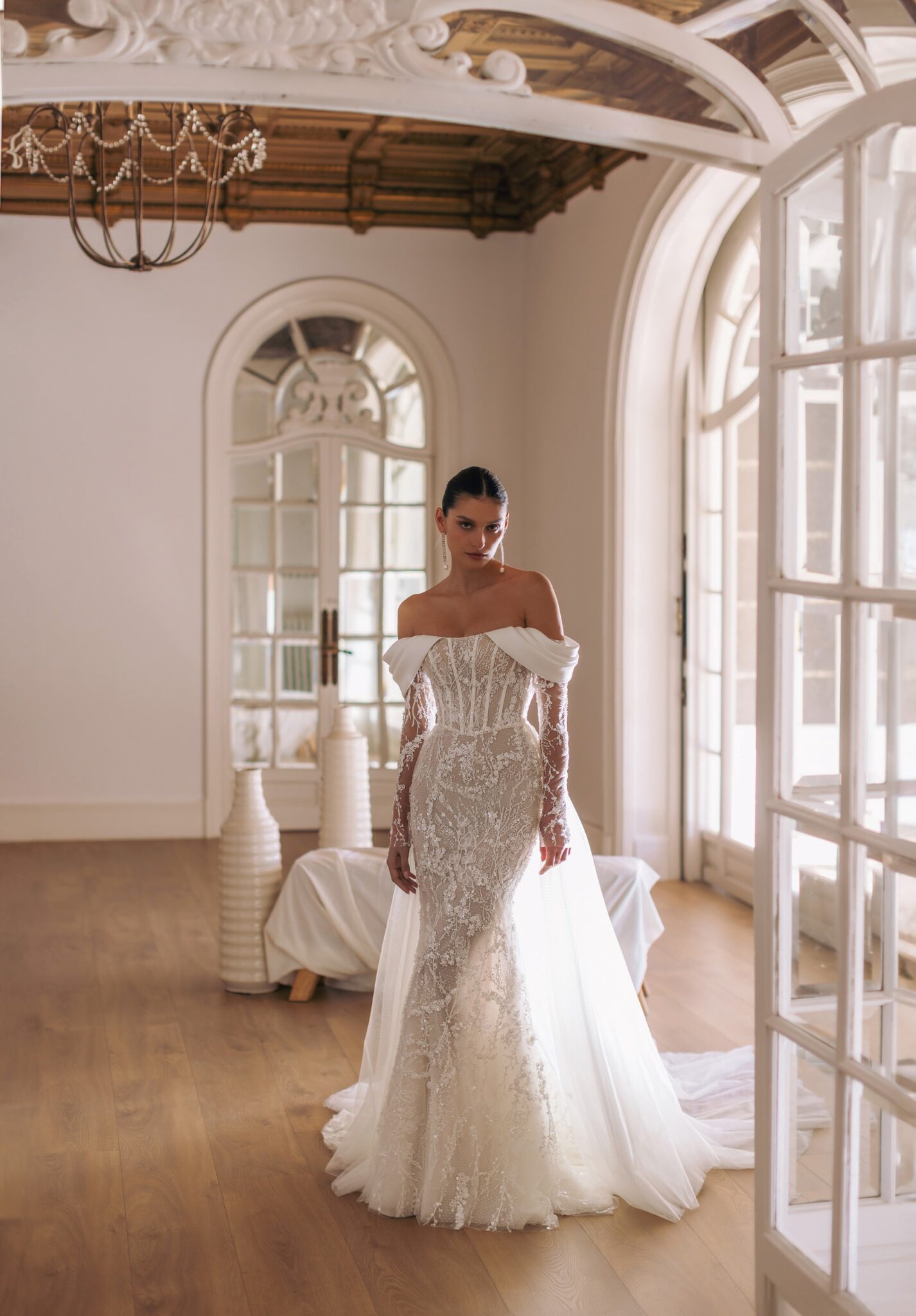 GeminiTulum – straight neckline strapless corset-based dress with sophisticated embroideries all over the mermaid silhouette. Featuring detachable overskirt made of tulle and smooth cold-shoulder bolero.