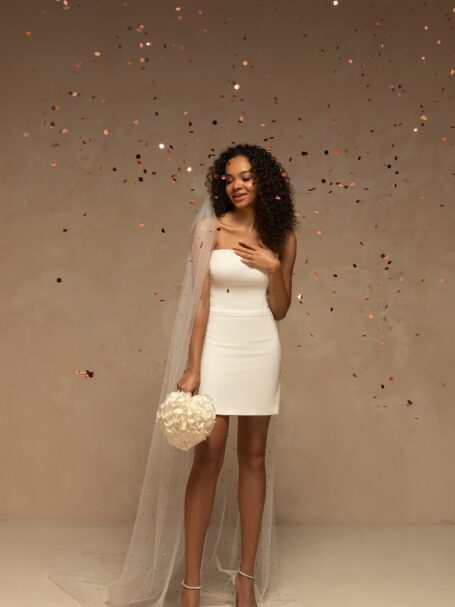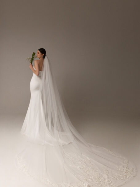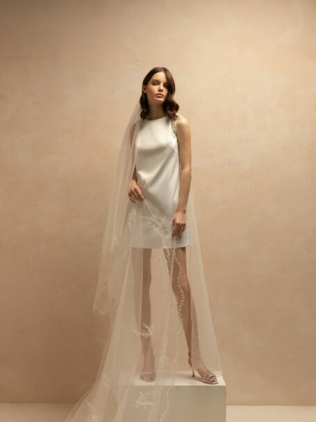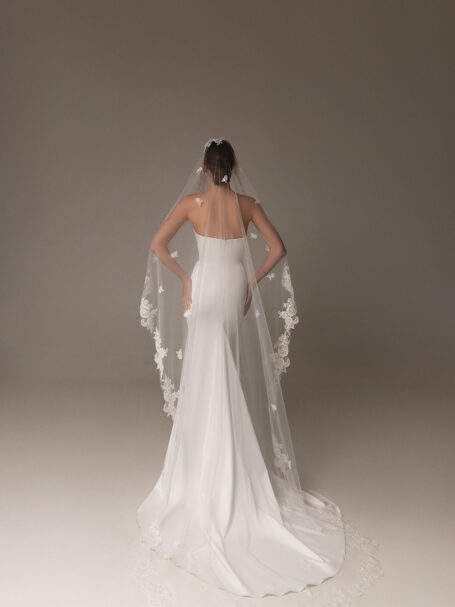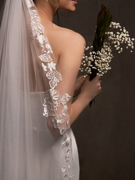 VeilsRomantic and tender single-tier bridal veil made of polka dot patterned tulle and decorated with beaded floral appliques. Available in cathedral length.