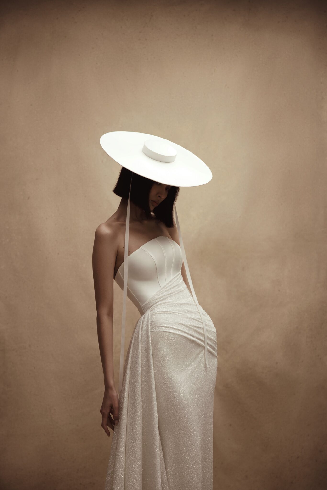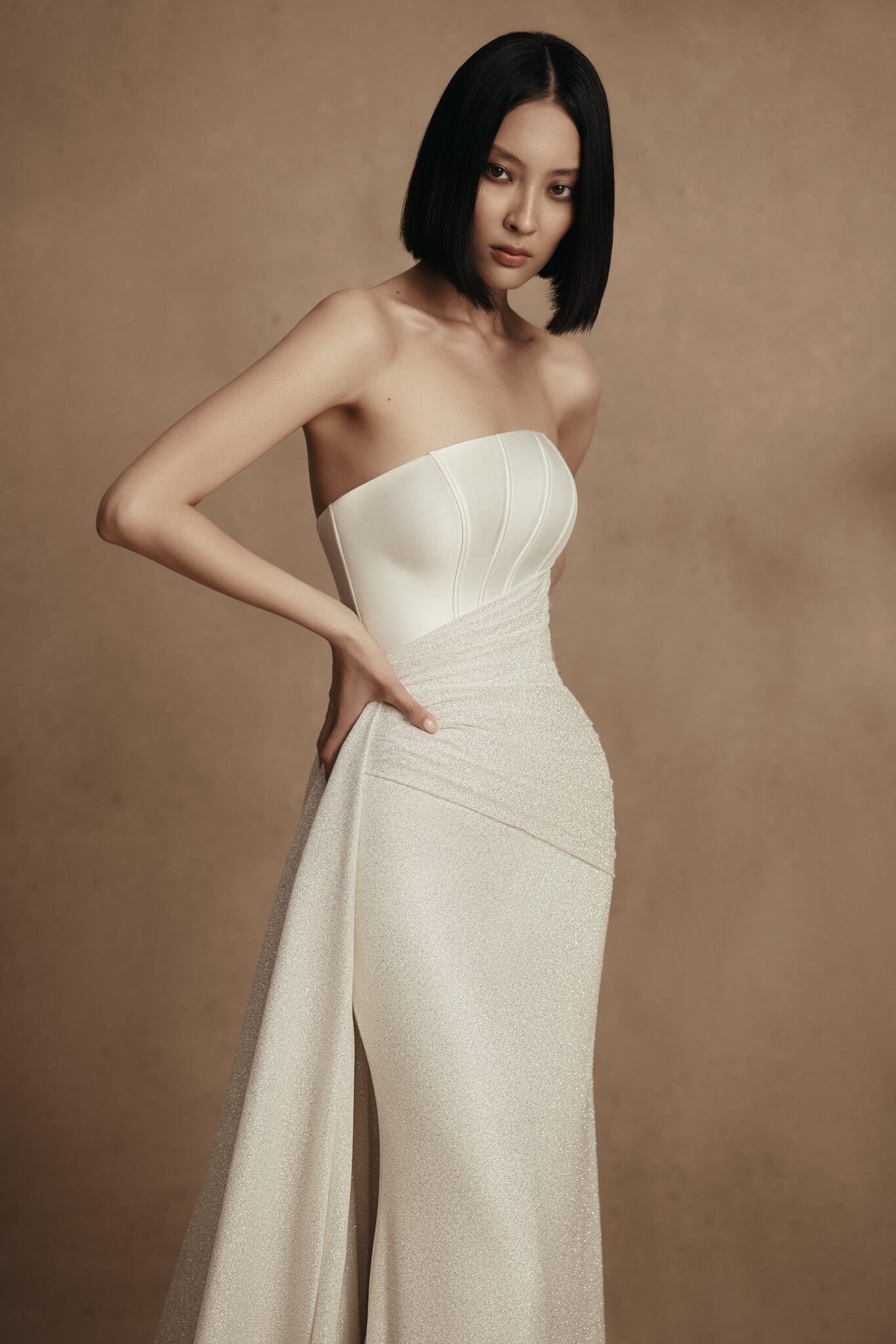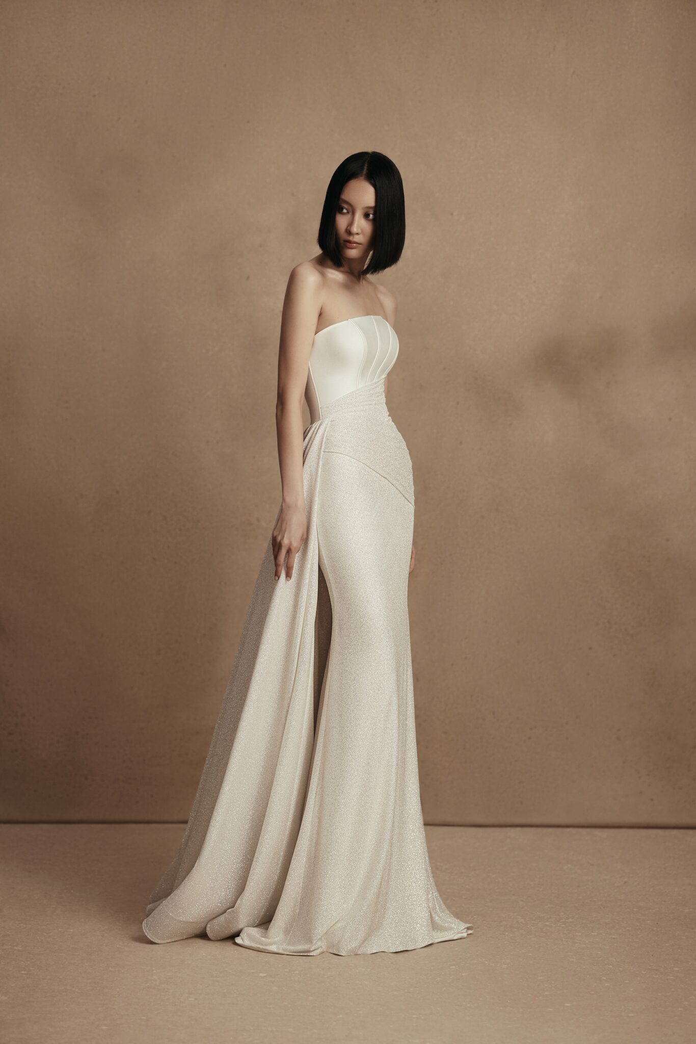 Personality, Plus SizeA gown is made of two kinds of fabric – stiff mikado and sparkling satin. Venera features an asymmetric Straight strapless corset that creates a feminine silhouette and highlights the bride’s waistline. A ssheath skirt falls to the floor length and an exquisite additional train made of mikado fabric is fixed on the waists.