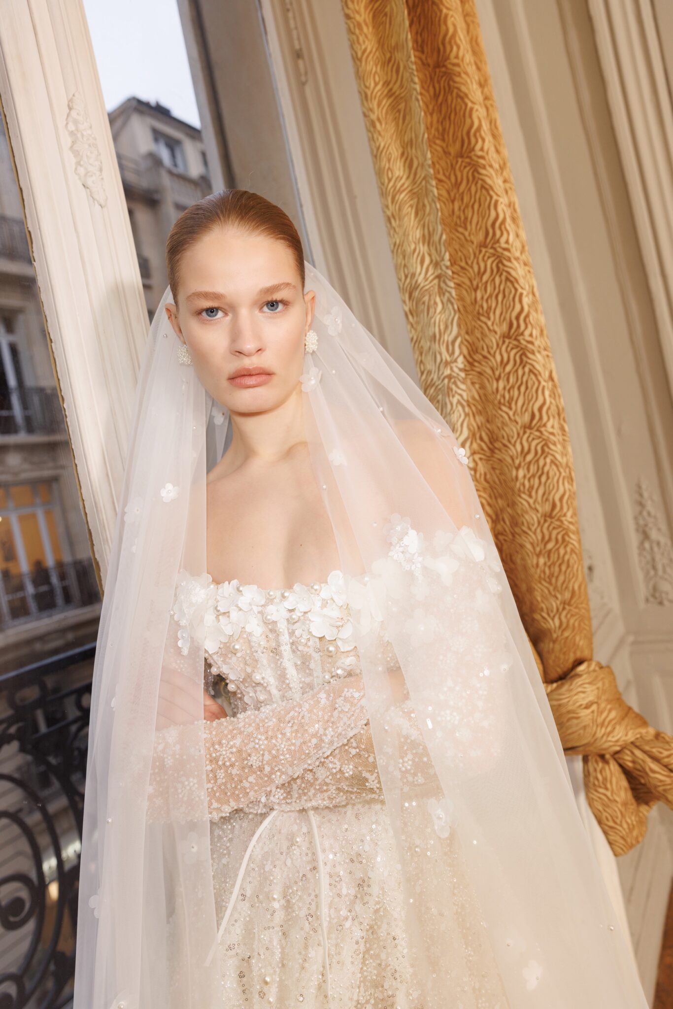 Atelier Lumiére, Plus SizeAn elegant gown featuring lace decorated structured corset with distinct lace-up at the back and detailed waistline. The voluminous skirt is also refined by floral hand-crafted lace and complemented with sheer floral decorated gloves.