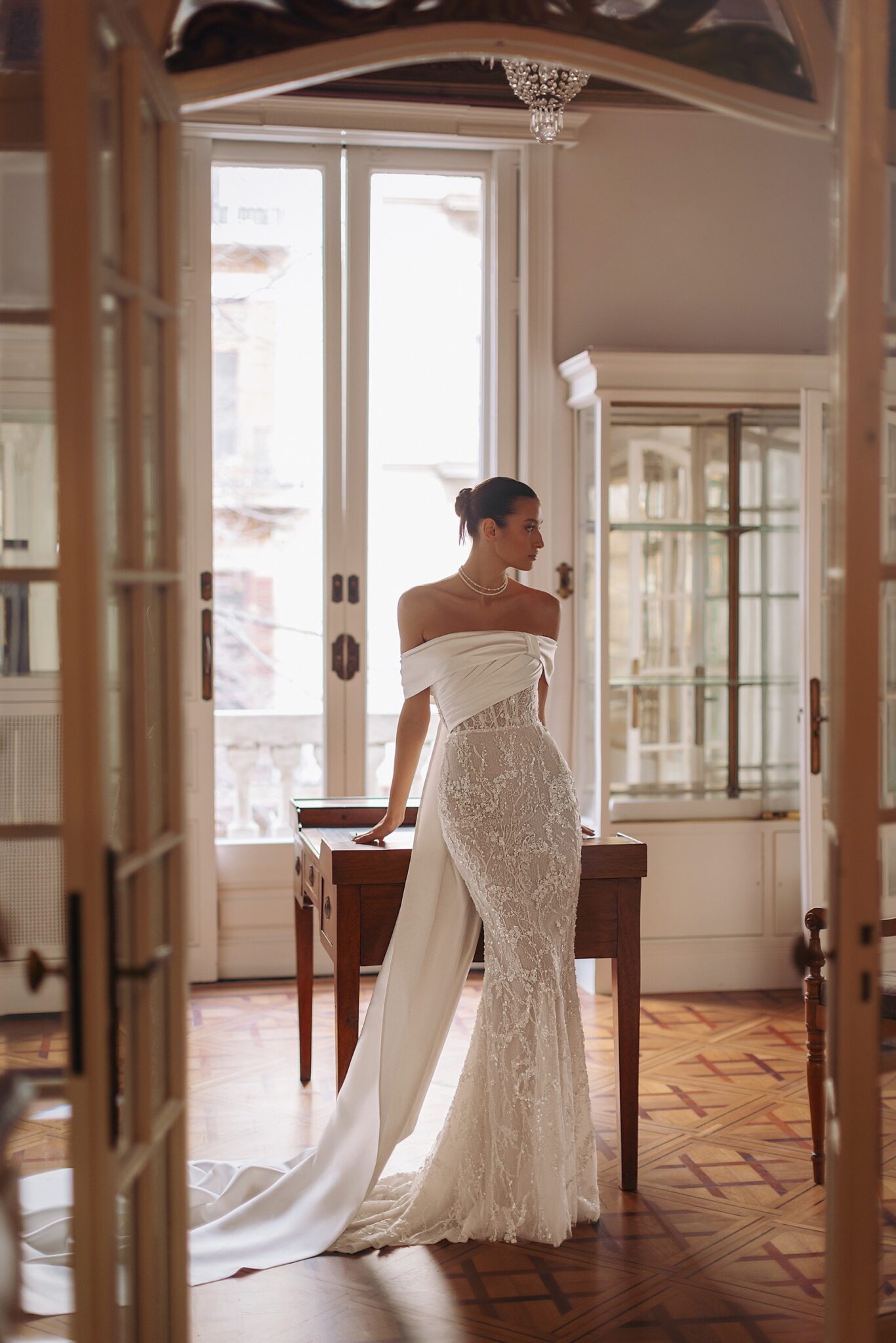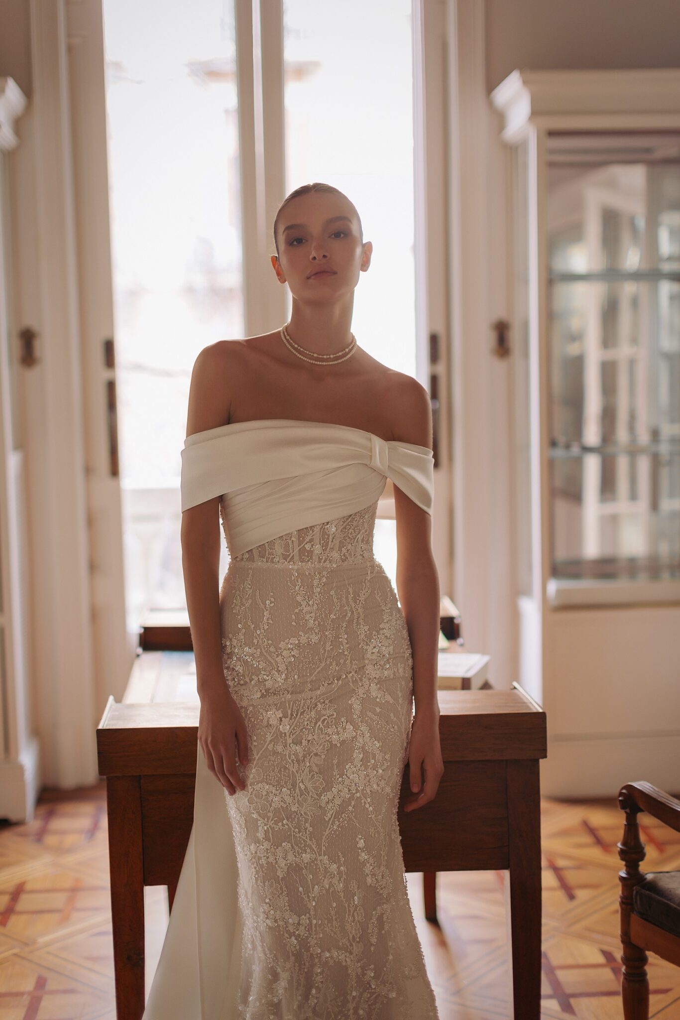 GeminiVenette – cold-shoulder straight neckline top with bow-like bolero-style sleeves descending to the back and mermaid tail silhouette with hand-crafted floral embroideries on semi-translucent mesh fabric.