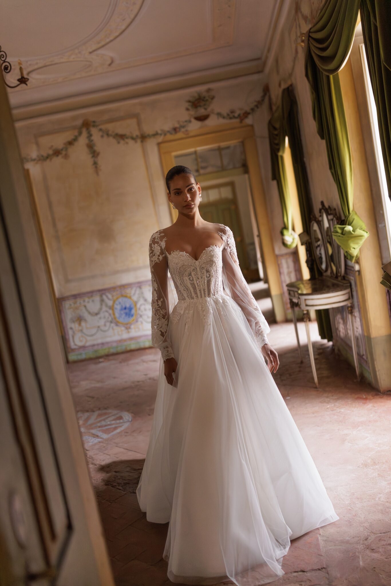 Bridal AlchemyAn elegant A-line silhouette gown featuring a romantic sweetheart neckline. The corset is beautifully adorned with lace, adding a touch of sophistication. The delicate long sleeves fasten with buttons at the cuffs and are also embellished with lace for an exquisite finish.