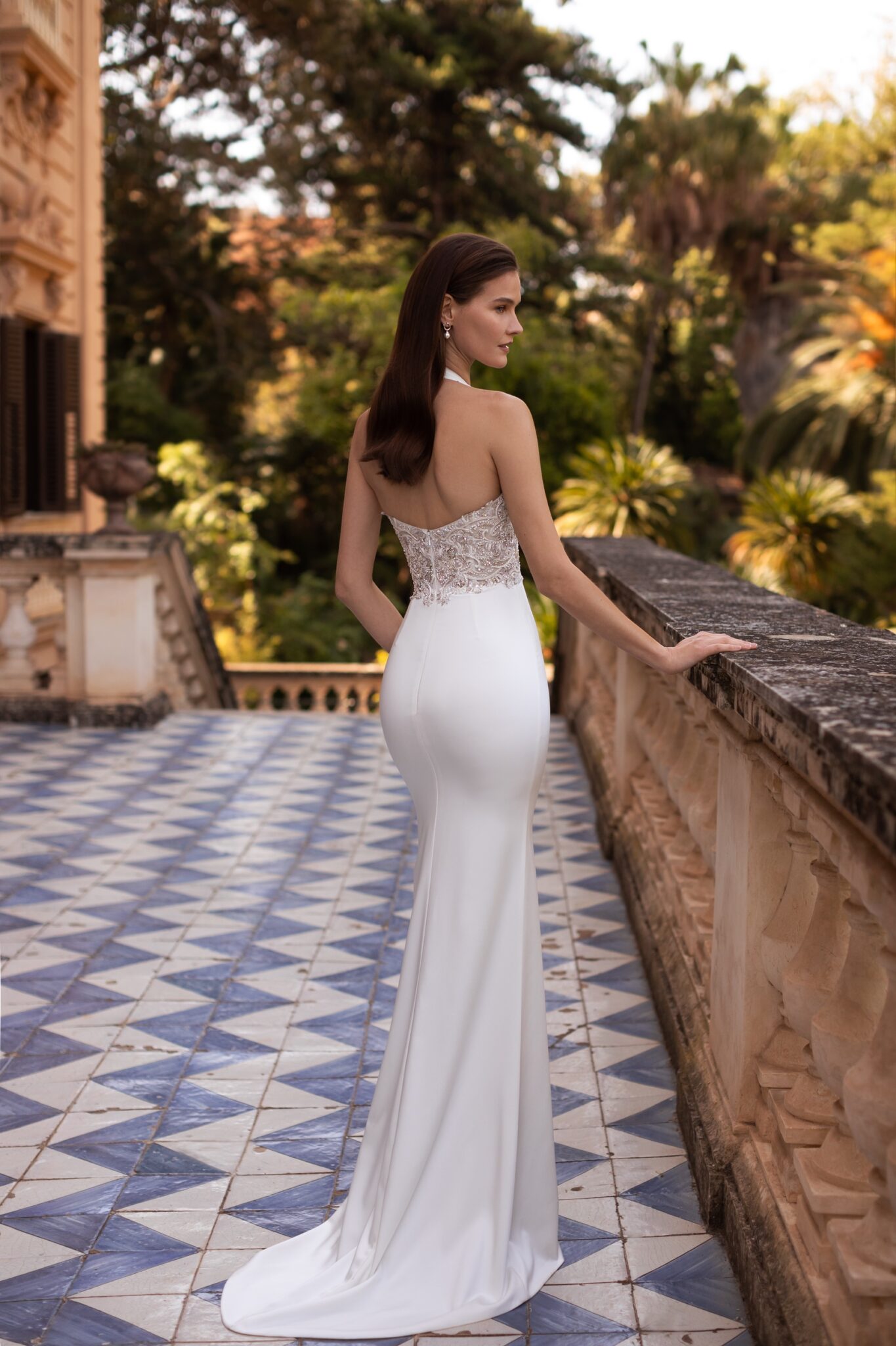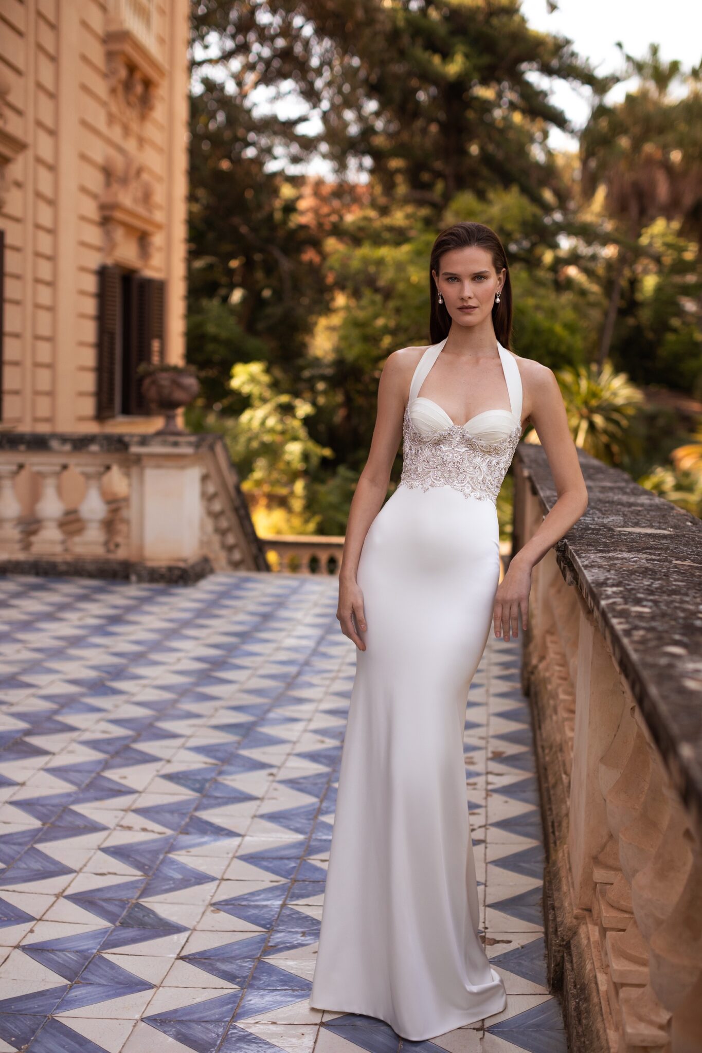 PalermoA retro styled mermaid gown with a super-fitted silhouette, cathedral train, and a sweetheart neckline lace corset with an around the neck wide strap is sexy and sophisticated. When designed in Ivory or silver patterned embroidery on a special Tulle a dress is paired with a fantastic classic satin overskirt that creates a smooth silhouette.