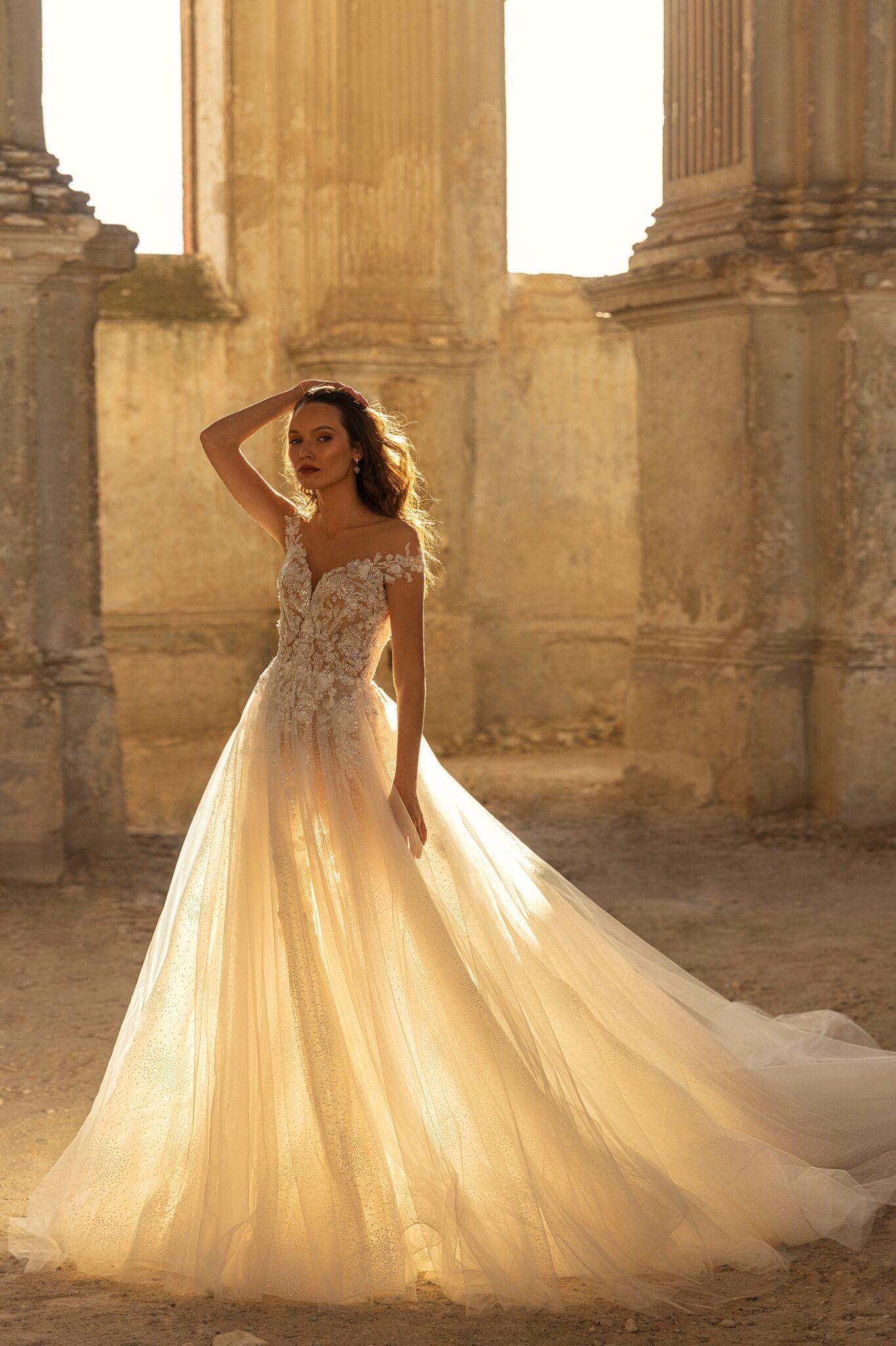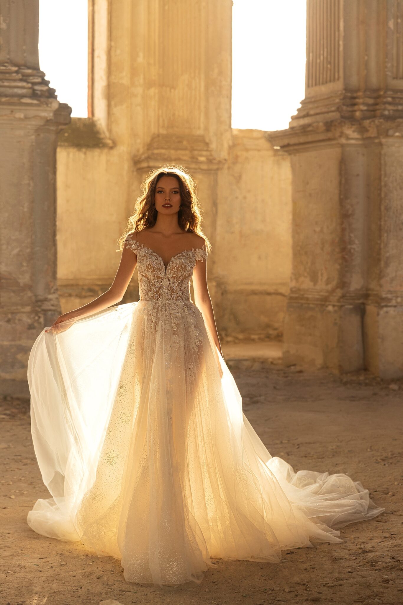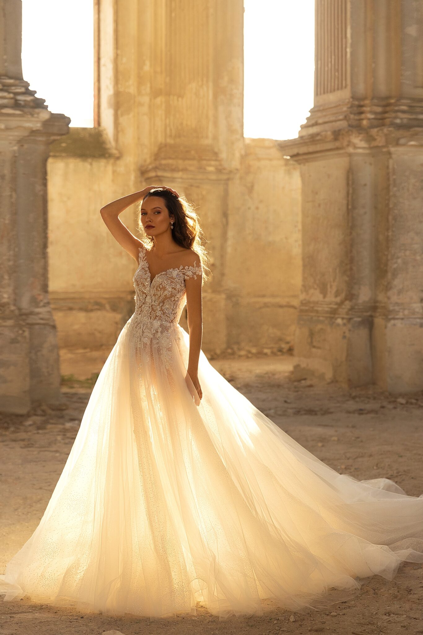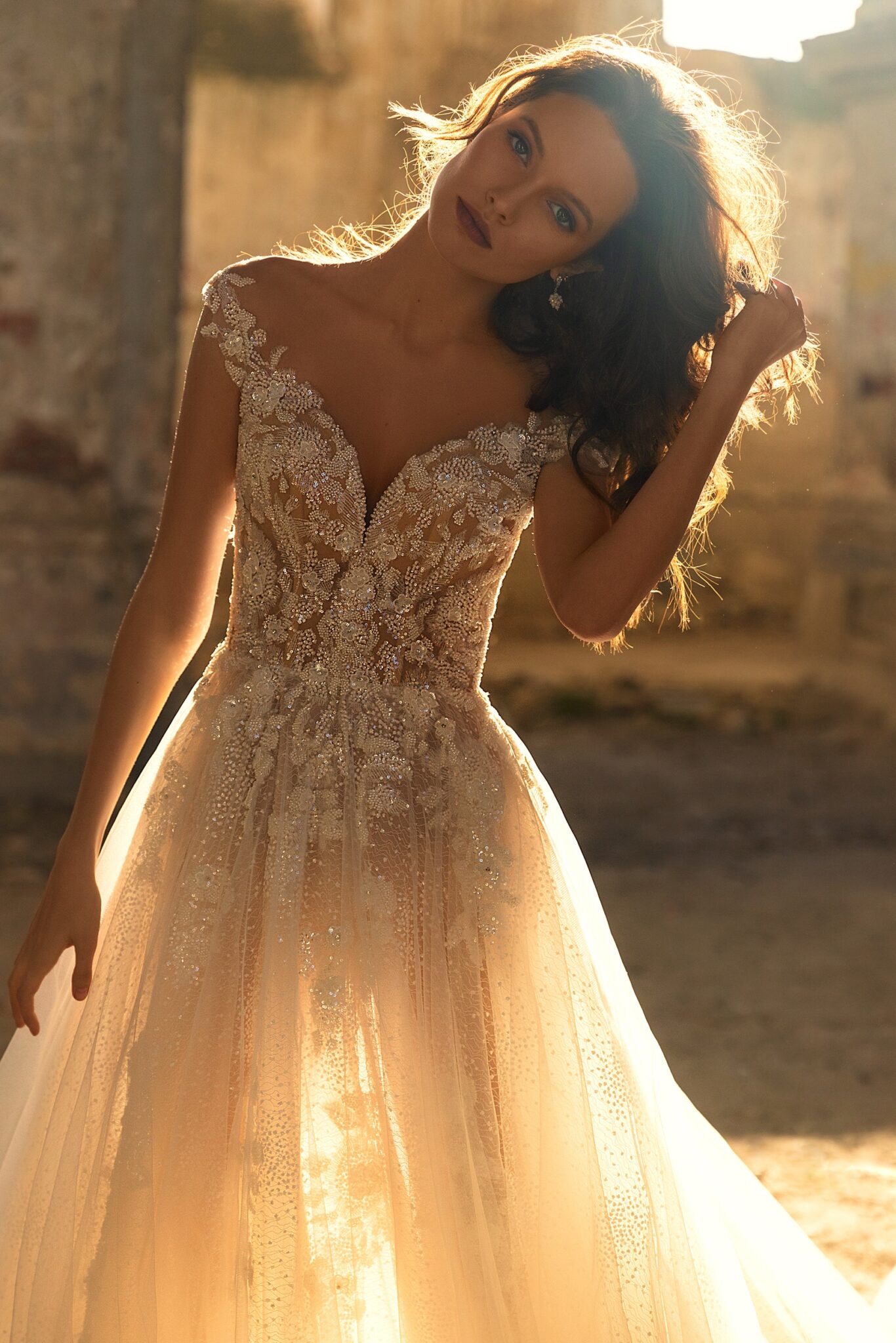 Golden HourVeronika gown is lightweight wedding dress with a sweetheart neckline and off shoulder sleeves. The skirt is made of the same lace and a corset and sparkly tule.