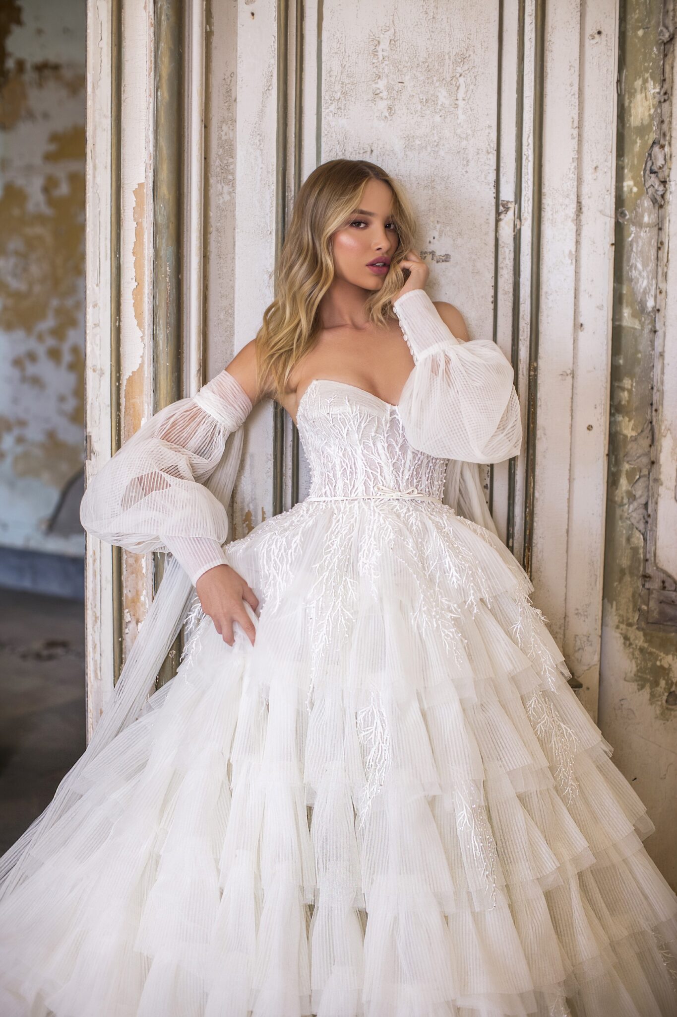 AuroraVictory bridal gown looks like a true piece of art. The combination of veiling and the laconic fabric looks Original and gorgeous. Sweetheart corsage is decorated with lace. A skirt is made of short layers of veiling and the skirt looks splendor. Sleeves are made of veiling and supplemented with long stripes. Cuffs with white Buttons complete this wedding dress.