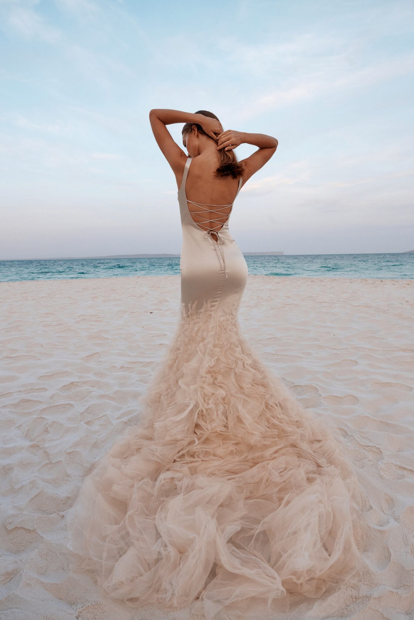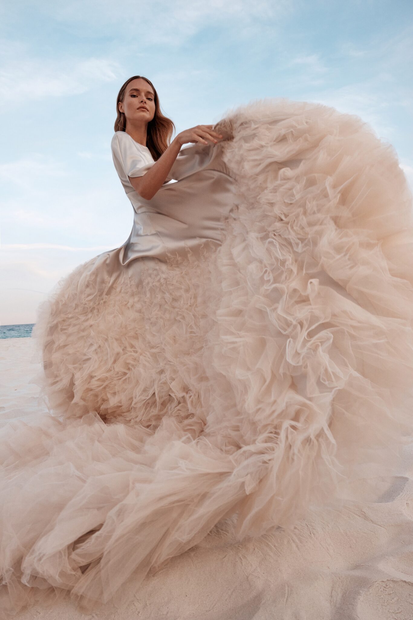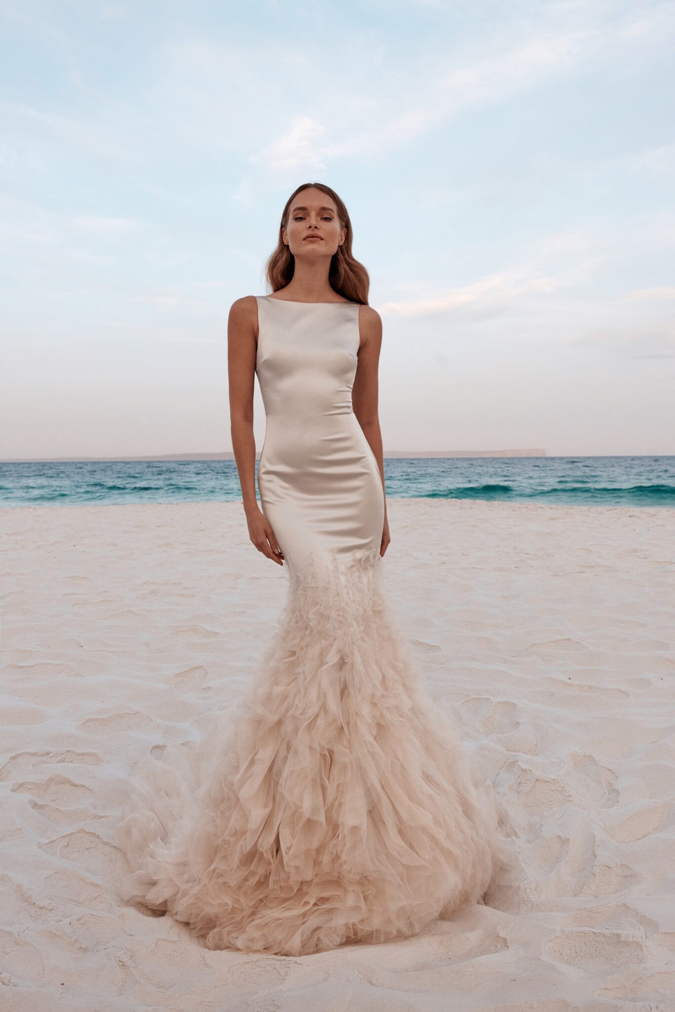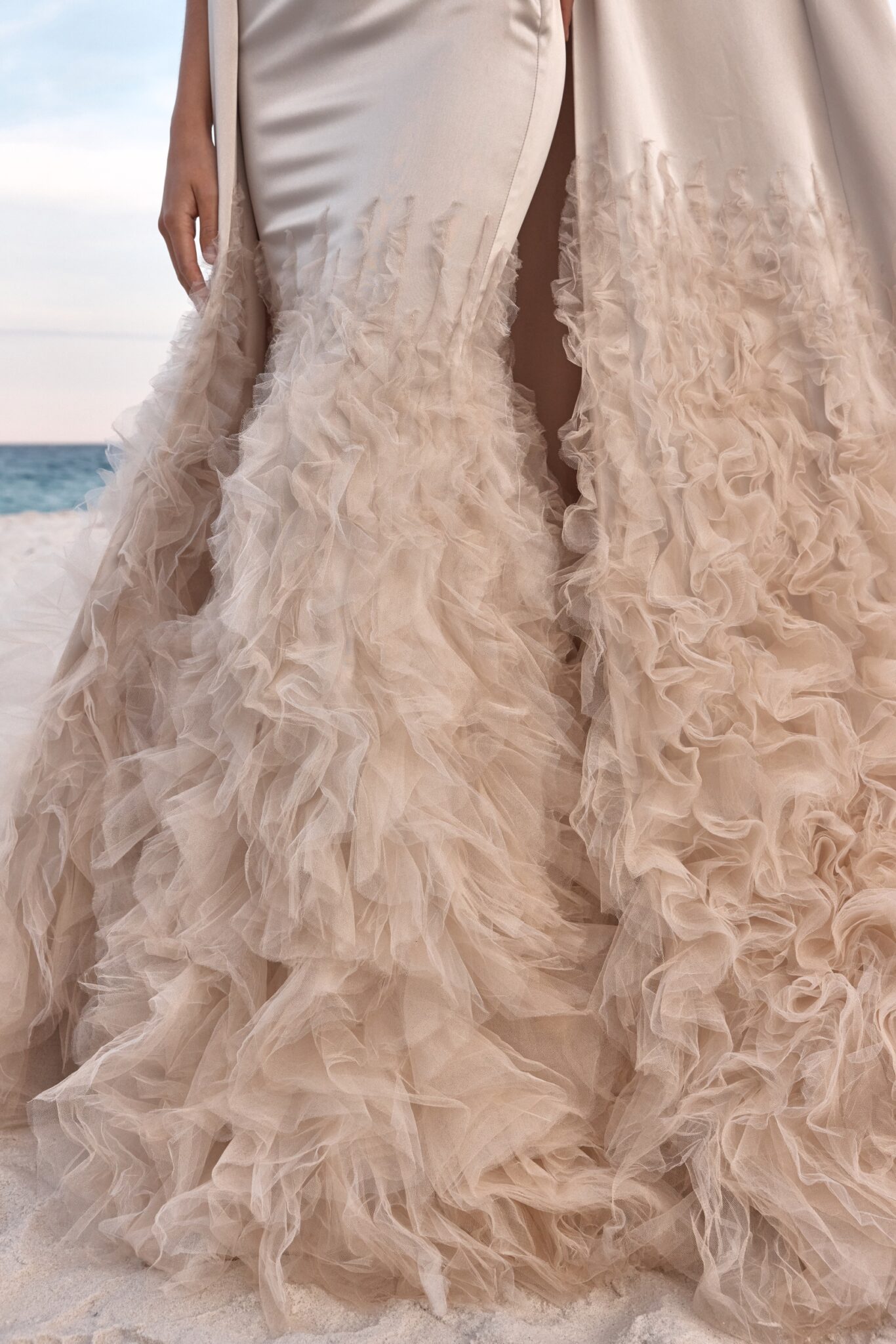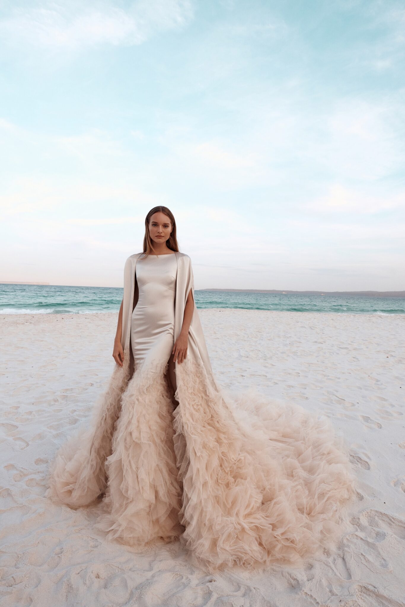 Atelier signature edition, Sample SaleThis mermaid satin wedding dress is a true spectacle of luxury and drama, featuring a sleek boat neckline. The voluminous ruffles cascading at the bottom create a magnificent, transformative effect leading to a stunning long train. For added grandeur, the detachable cape, made of the same fabric and embellished with matching ruffles, ensures the bride makes an unforgettable entrance on her special day.