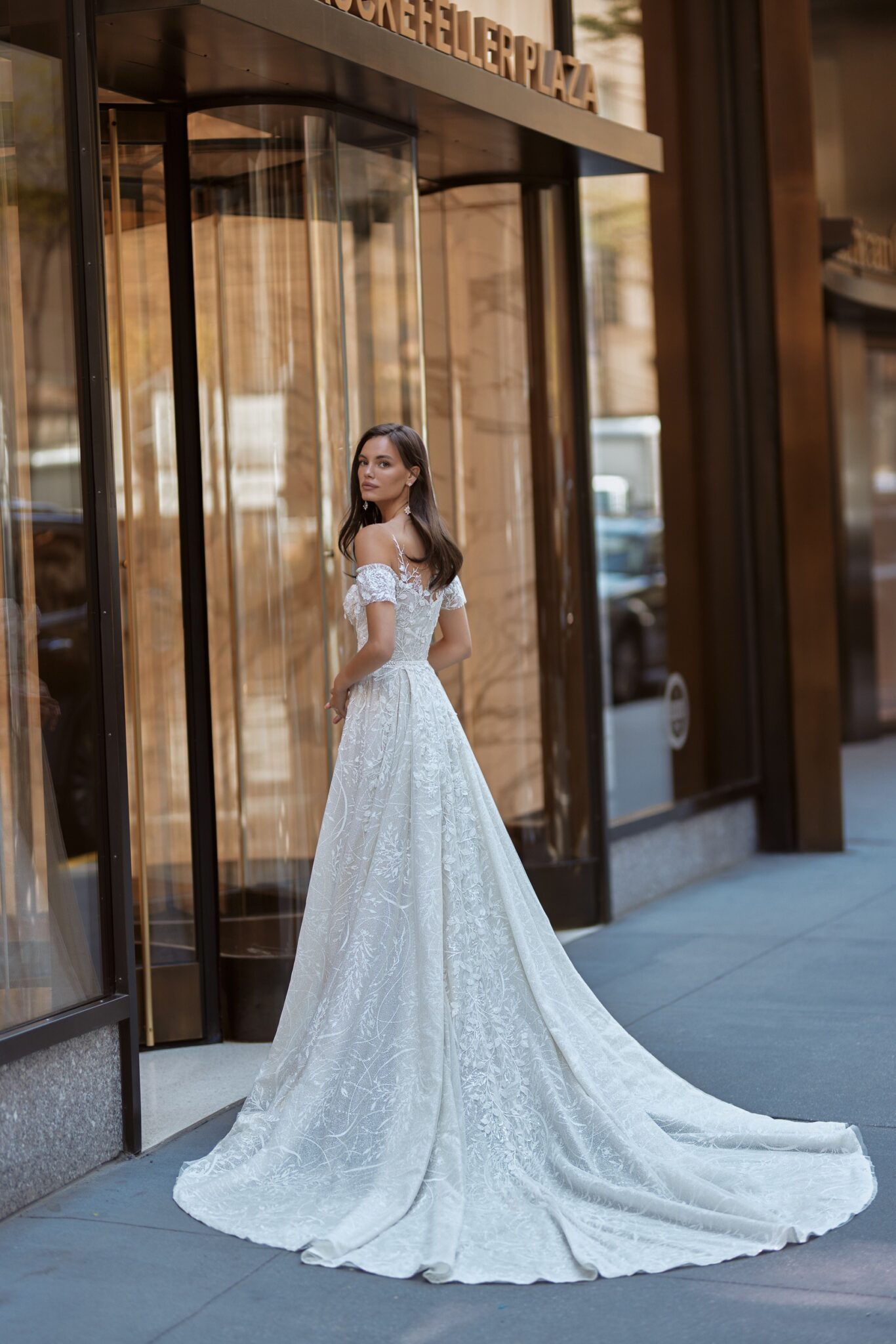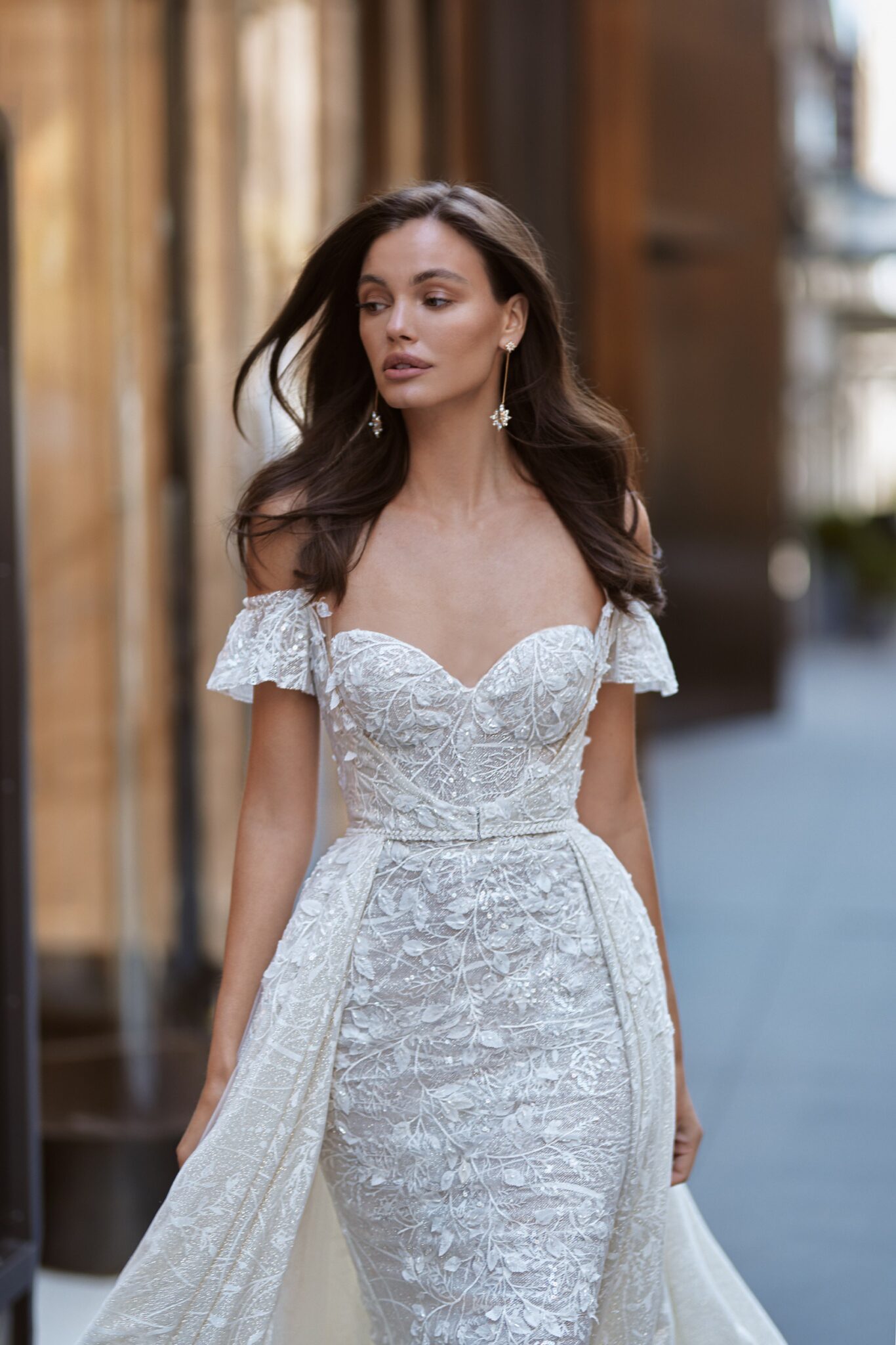 Love in the CityWednesday is a shining and sparkling bridal gown with lowered shoulders, decorated with 3D lace. The sheath dress is made of delicate lace and has an elegant mermaid style. The corsage is strapless and decorated wuth floral lace. The luxury cape has lowered short sleeves and lush additional skirt with long train, that adds femininity to this wedding look.