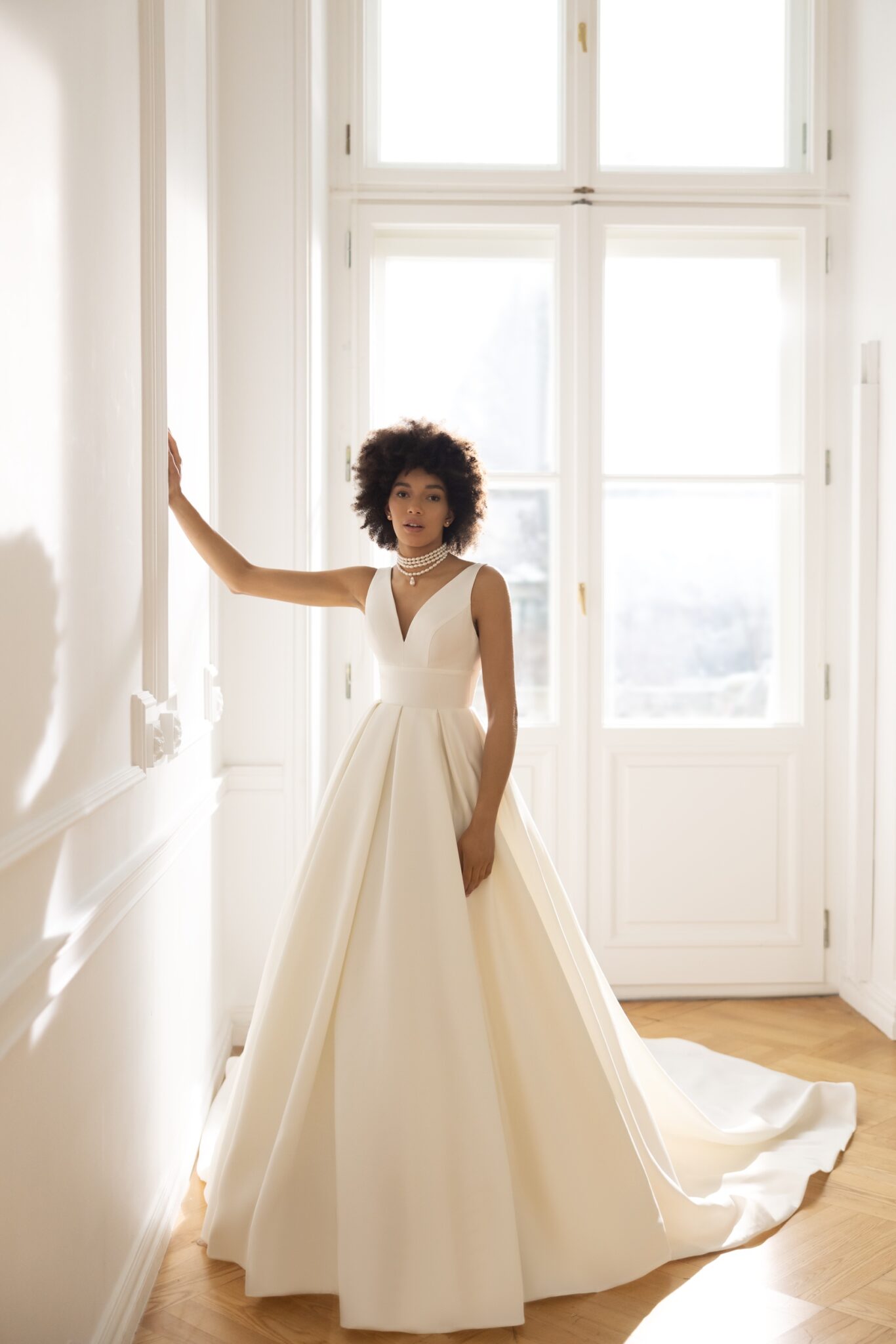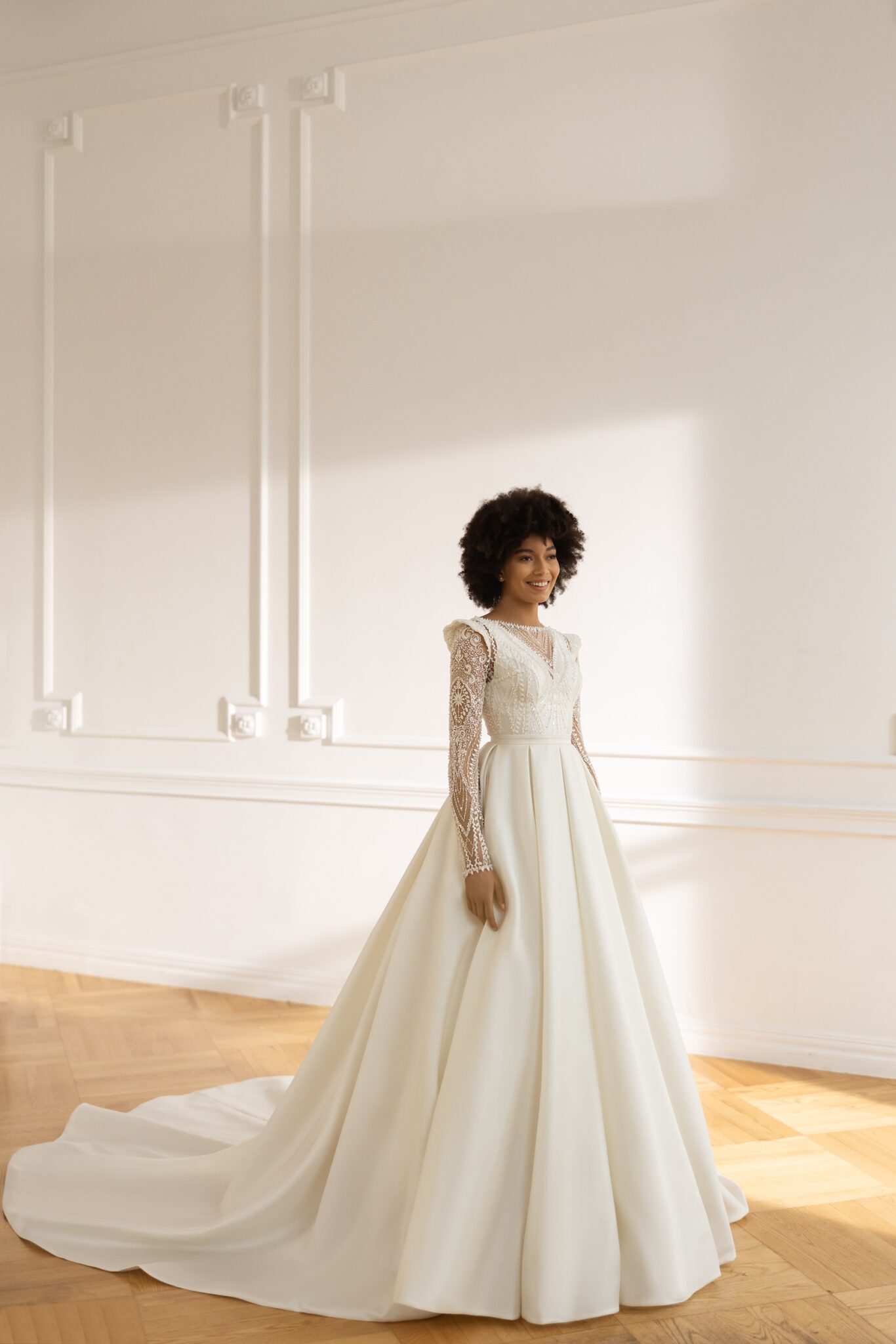 Less is more 2023Feel special wearing this unique gown on your wedding day. Crafted in our gorgeous Mikado silk it is paired with unusual threaded lace fabric with transparent sequins, beads and pearls on a detachable bolero. Illusion V plunge on the neckline adds a touch of allure to the bodice which is embellished with beaded lace. Lond illusion sleeves with strong shoulders cover the arms. Illusion V-backline is finished with neat Buttons. Gorgeous mikado skirt falls down with delicate folds and a cathedral train gives the dress a final touch of royalty
