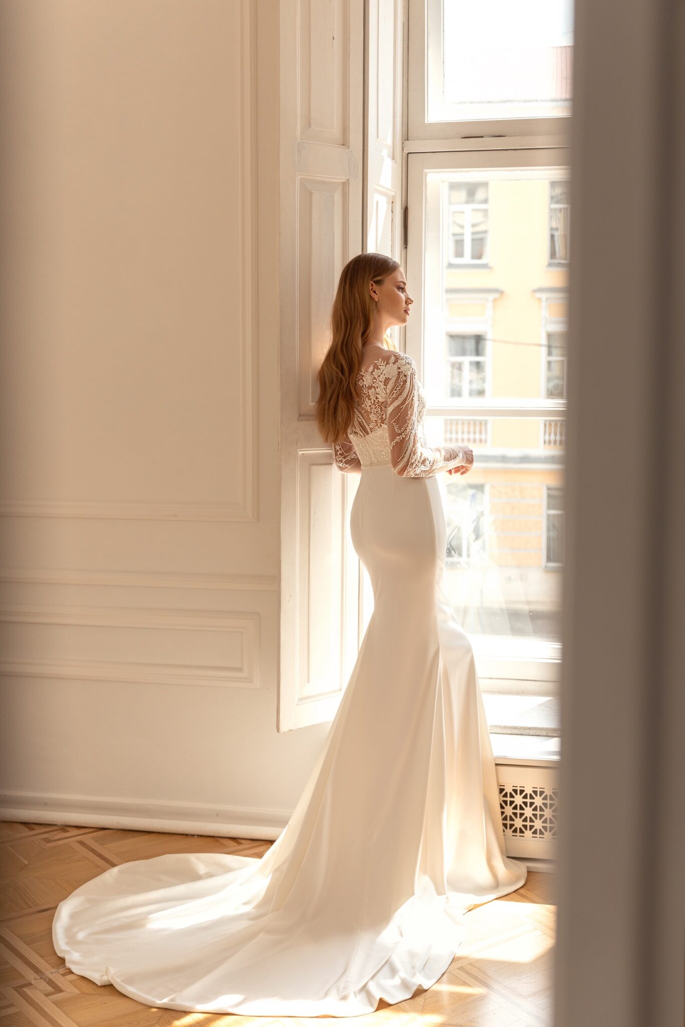 Less is more 2022Yanina is a bridal gown to create an elegantl royal look. The top of the dress is fully decorated with embroidered floral lace with beads and spangles. The top has a sweetheart neckline covered with lace with high neckline on the front and on the back of the dress. Semi-transparent long sleeves embellished with the same lace add luxury. The beautiful skirt of mermaid silhouette made of glossy satin widens down the knees and passes into a long train.