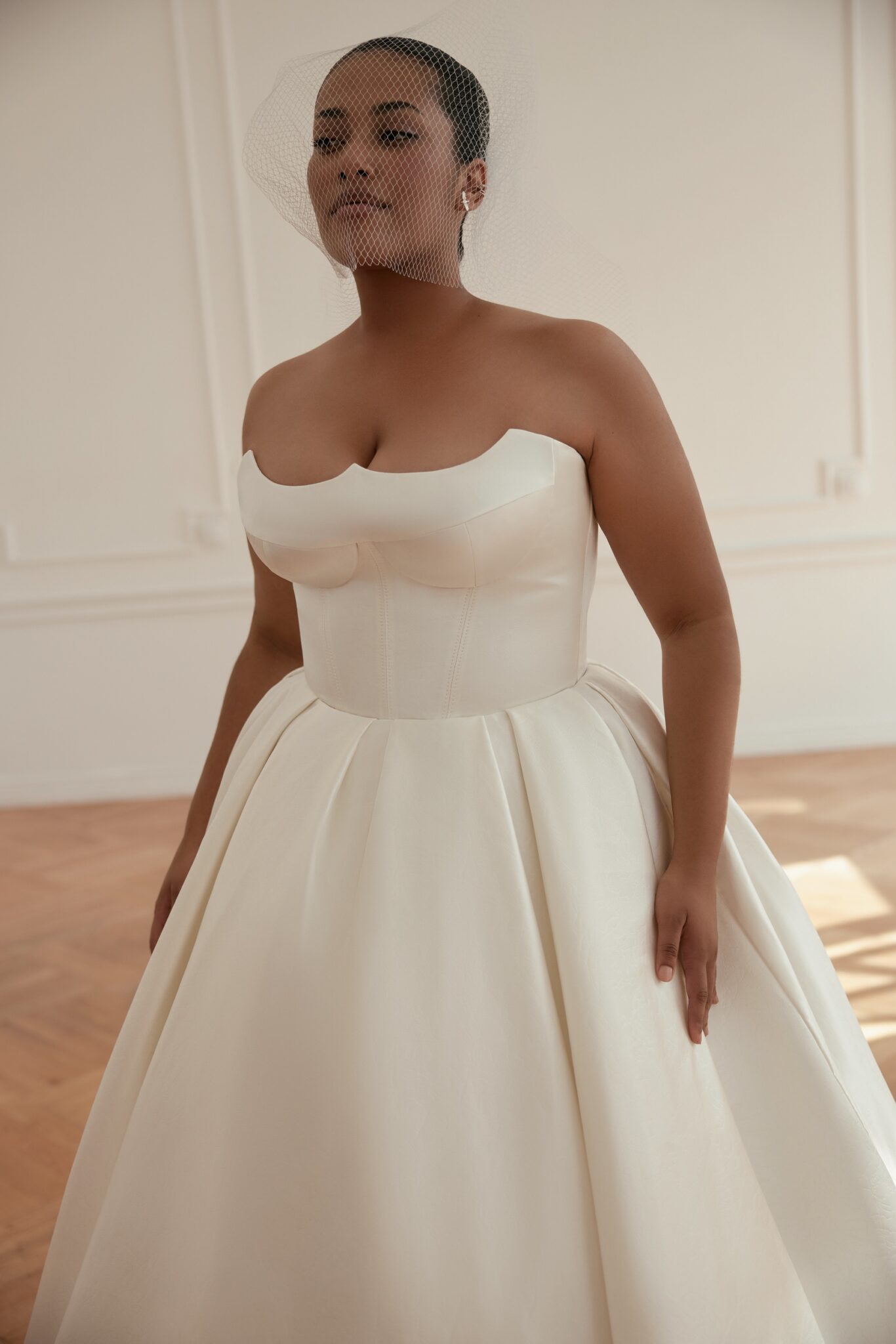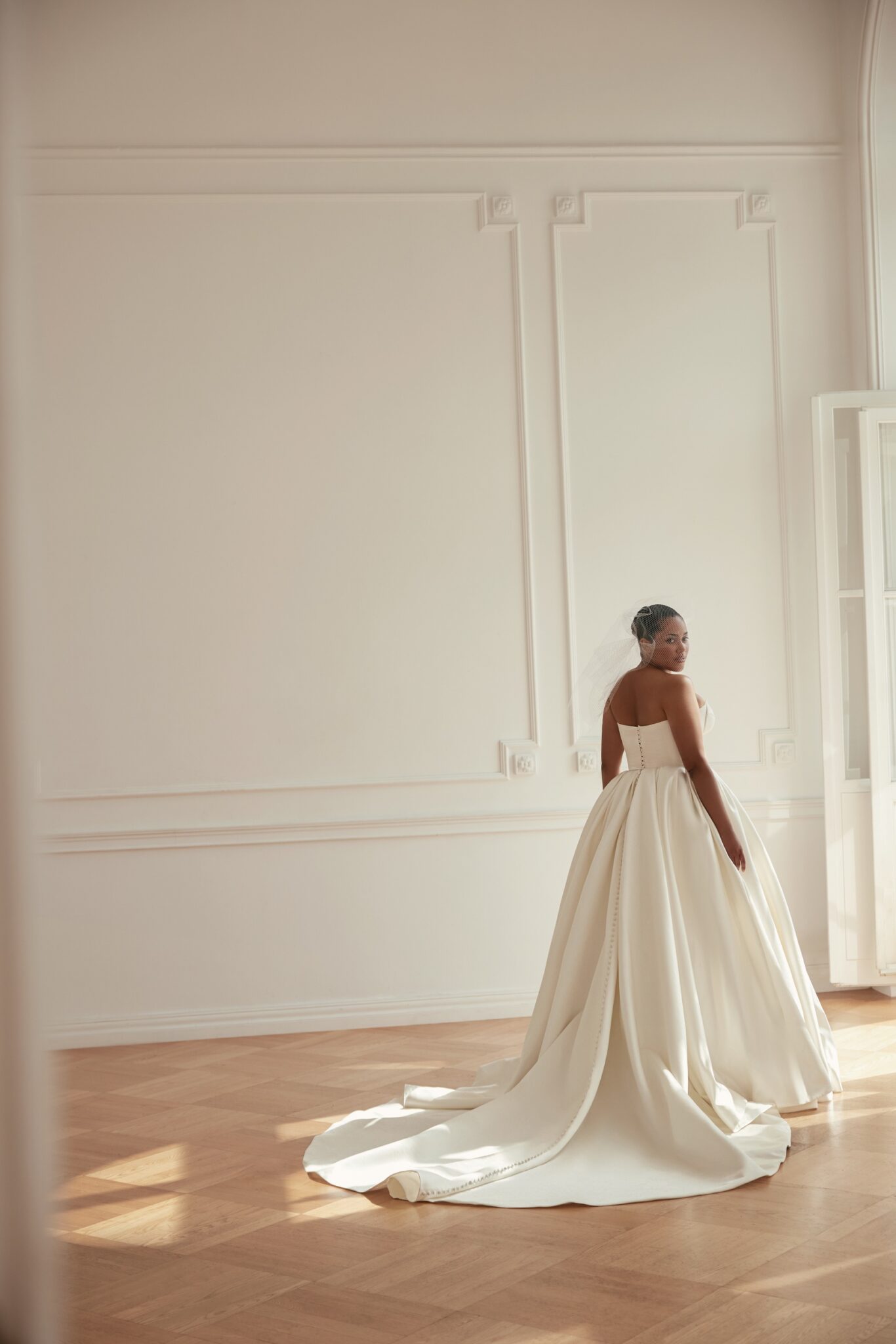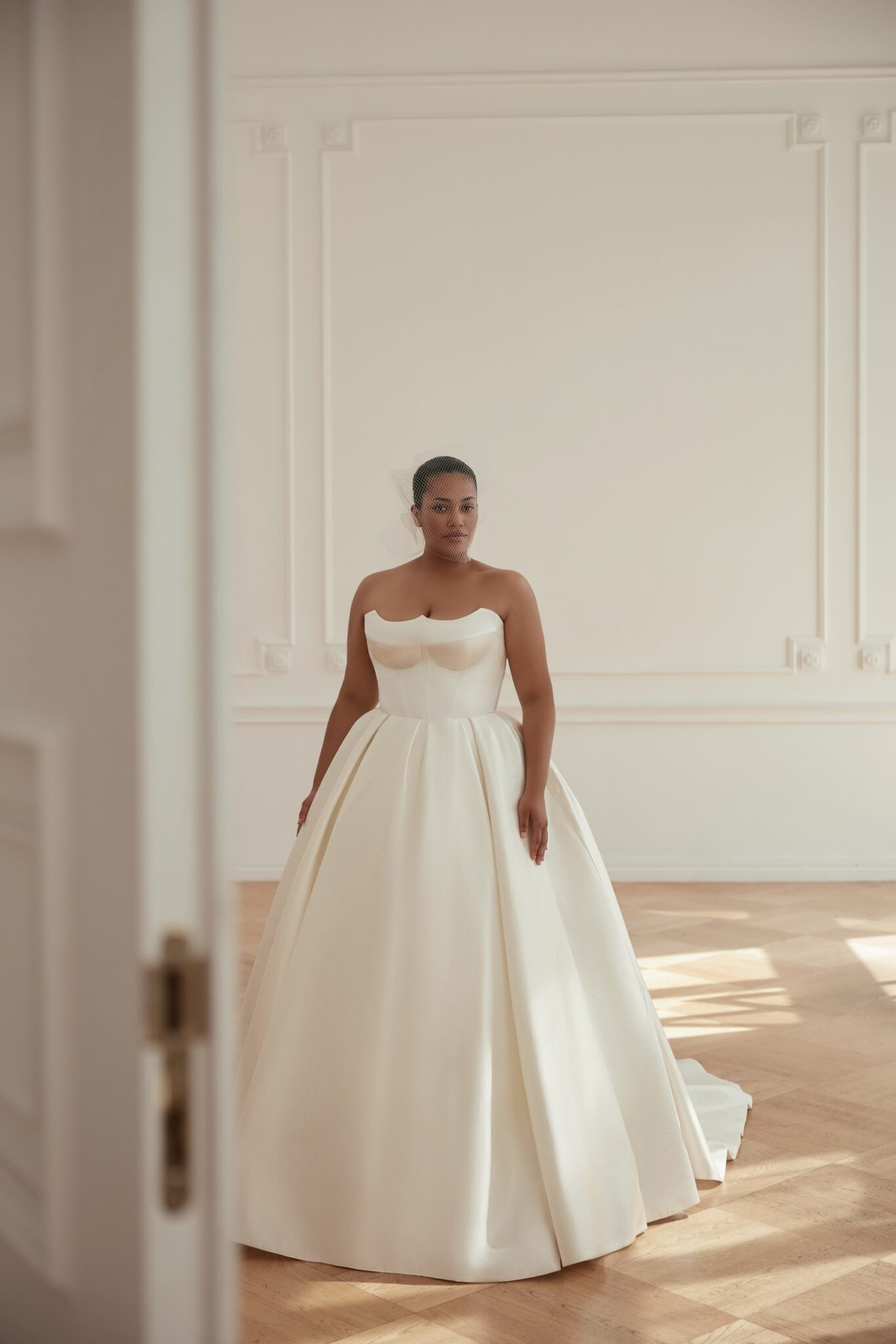 Atelier signature editionThis ballgown wedding dress is a vision of timeless elegance, crafted from exquisite jacquard fabric that adds a touch of regal grandeur. The strapless neckline exudes modern chic, making it a perfect choice for the bride who desires a look that seamlessly blends classic charm with contemporary style on her special day.