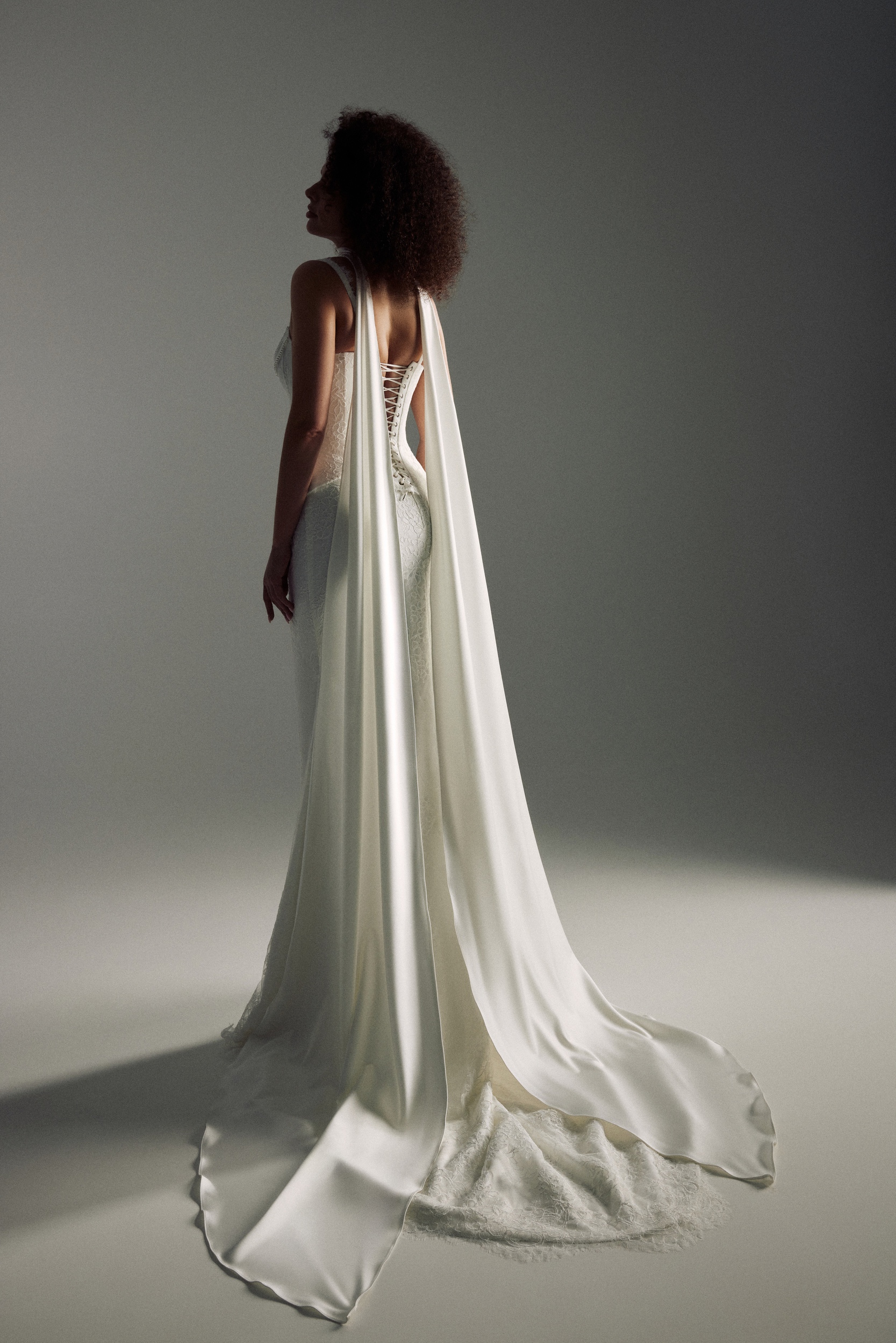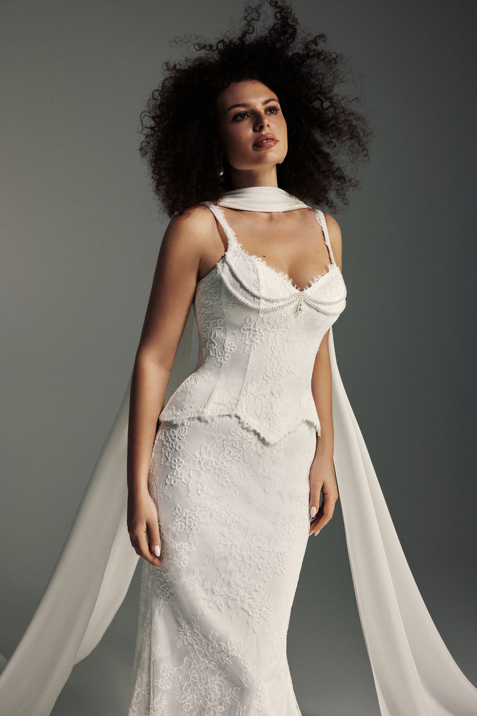 Blooming LoveZinnia is a romantic and sculptural bridal gown designed in delicate Chantilly lace, featuring a structured, lowered corset that beautifully accentuates the waist. A sweetheart neckline with lace straps and subtle pearl detailing on the front adds elegance and femininity, while a sheath skirt flows effortlessly; optional scarf-like wings create a dramatic train, complemented by lacing on the corset for a refined, architectural finish.